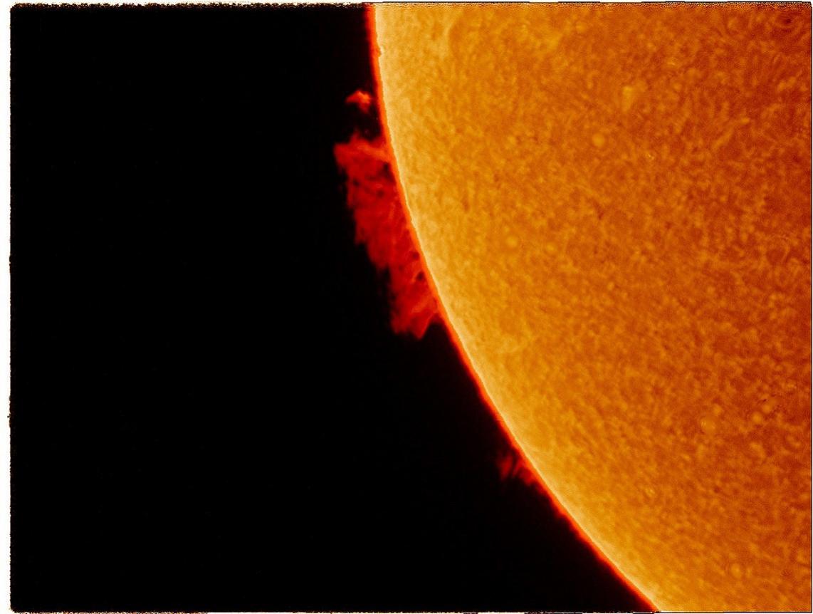 Lundi un beau soleil au moins jusqu'a 15H00 a permis de faire quelques clichés de cette superbe protuberance, en visu c'etait fabuleux et j'ai pu pousser la Bino avec la Barlow X3 televue avec une image stable.