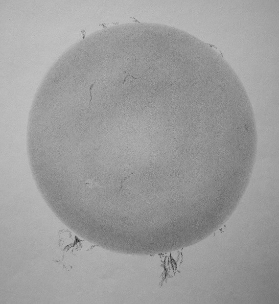 Le dessin fait ce matin vers 11h30 heure légale, de ces très belles protubérances, fait entre pas mal de gros nuages.