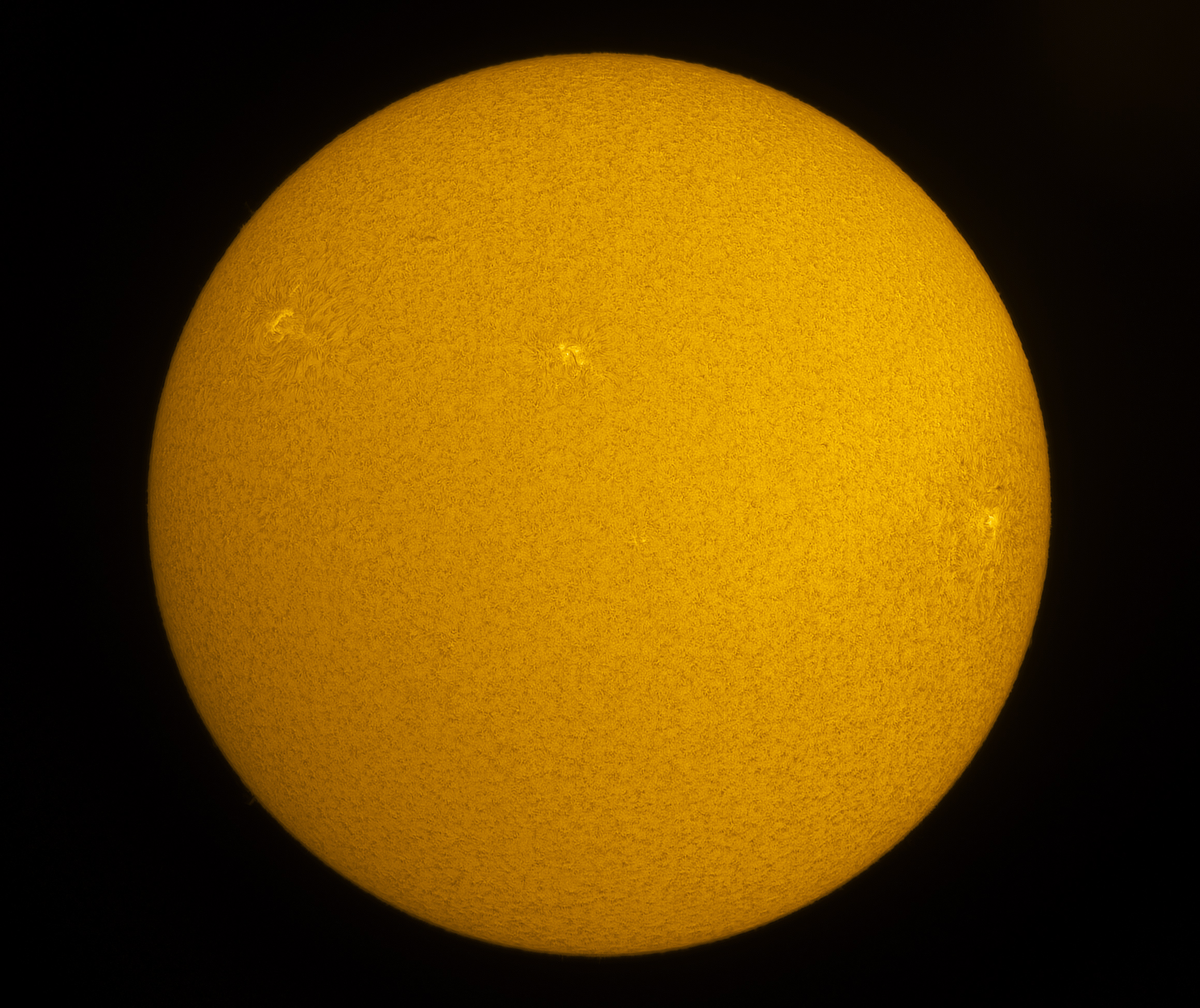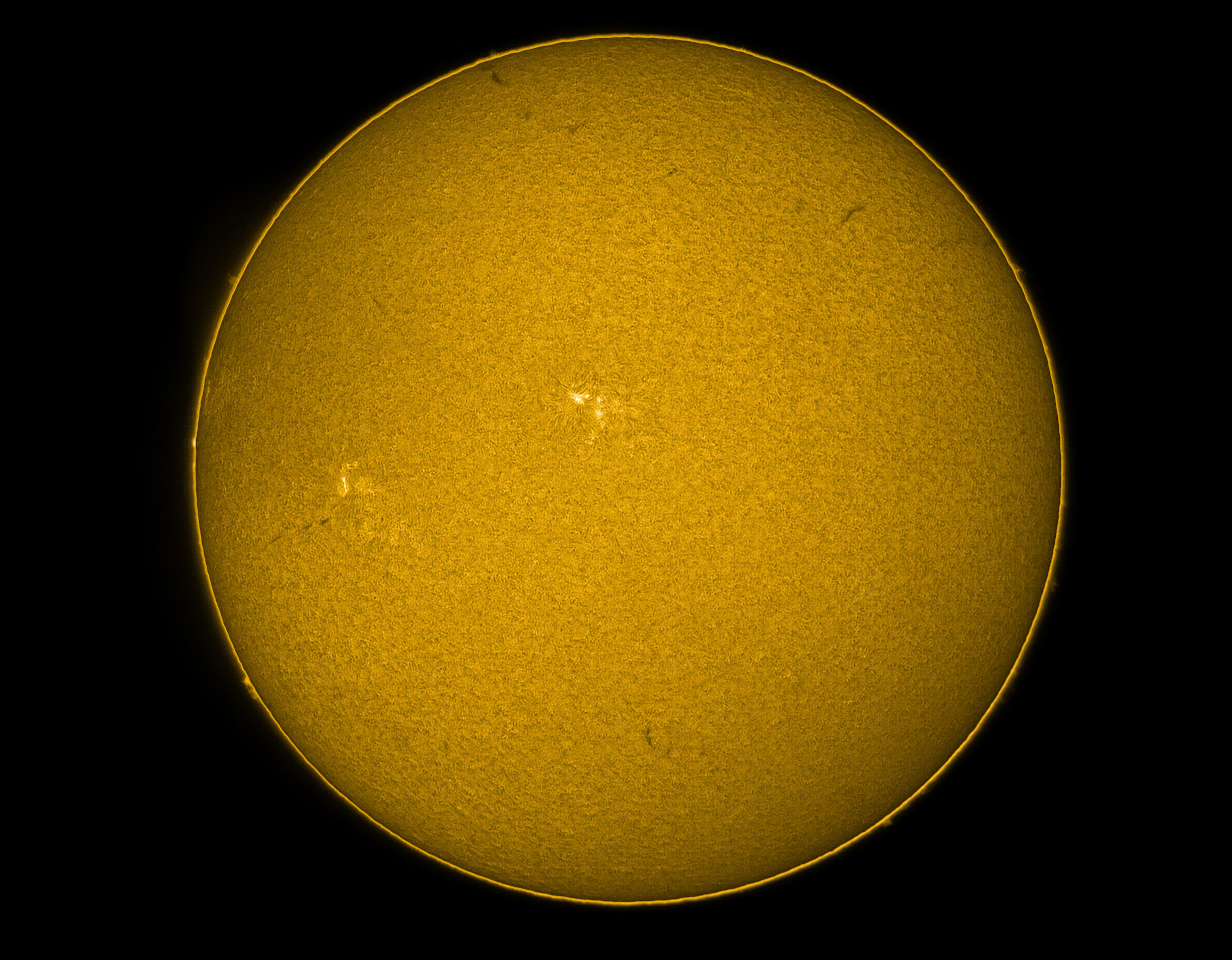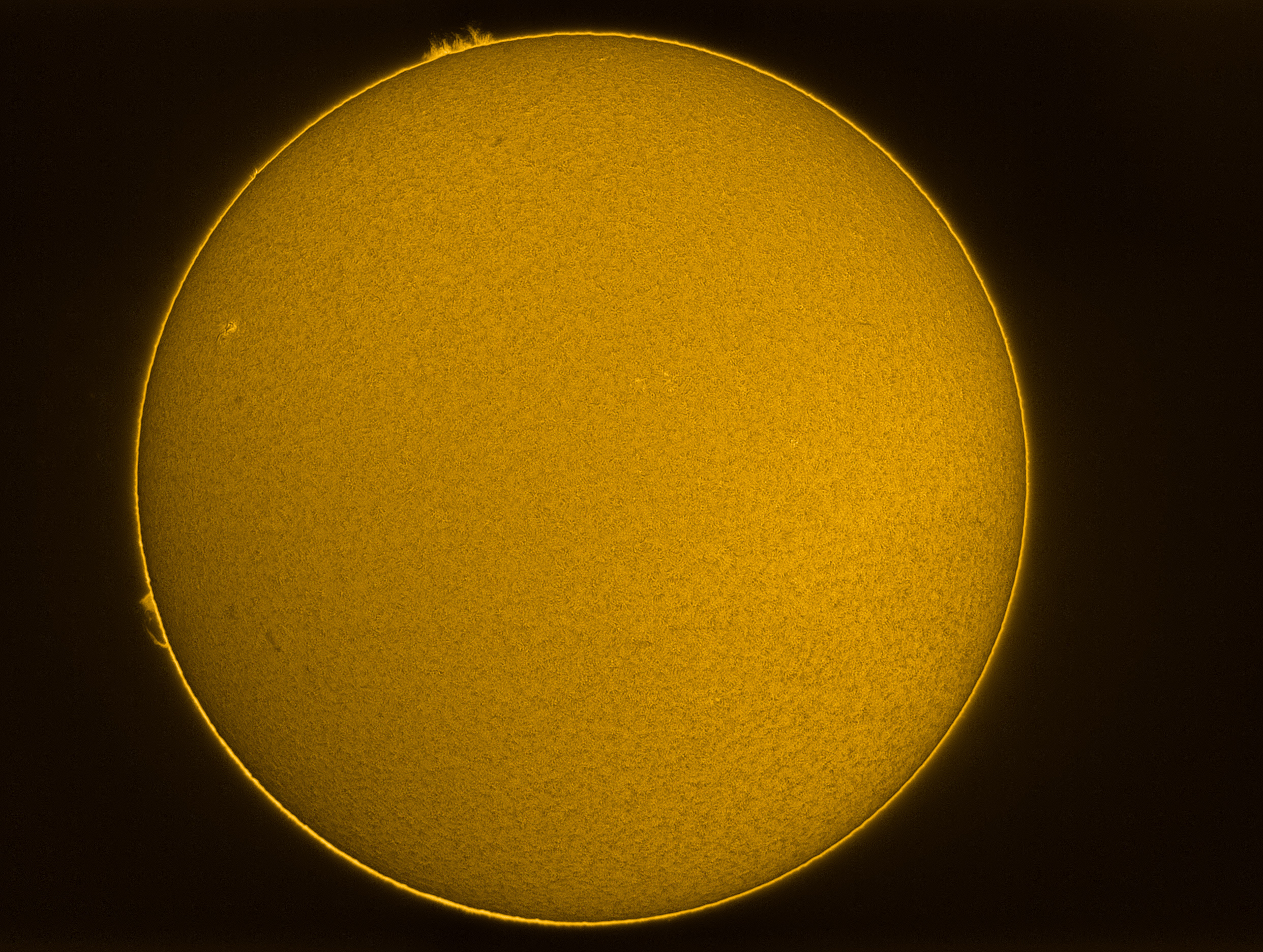 Le minimum solaire est bien présent. De petites protubérances, et un minuscule filament en bas, aucune tache.