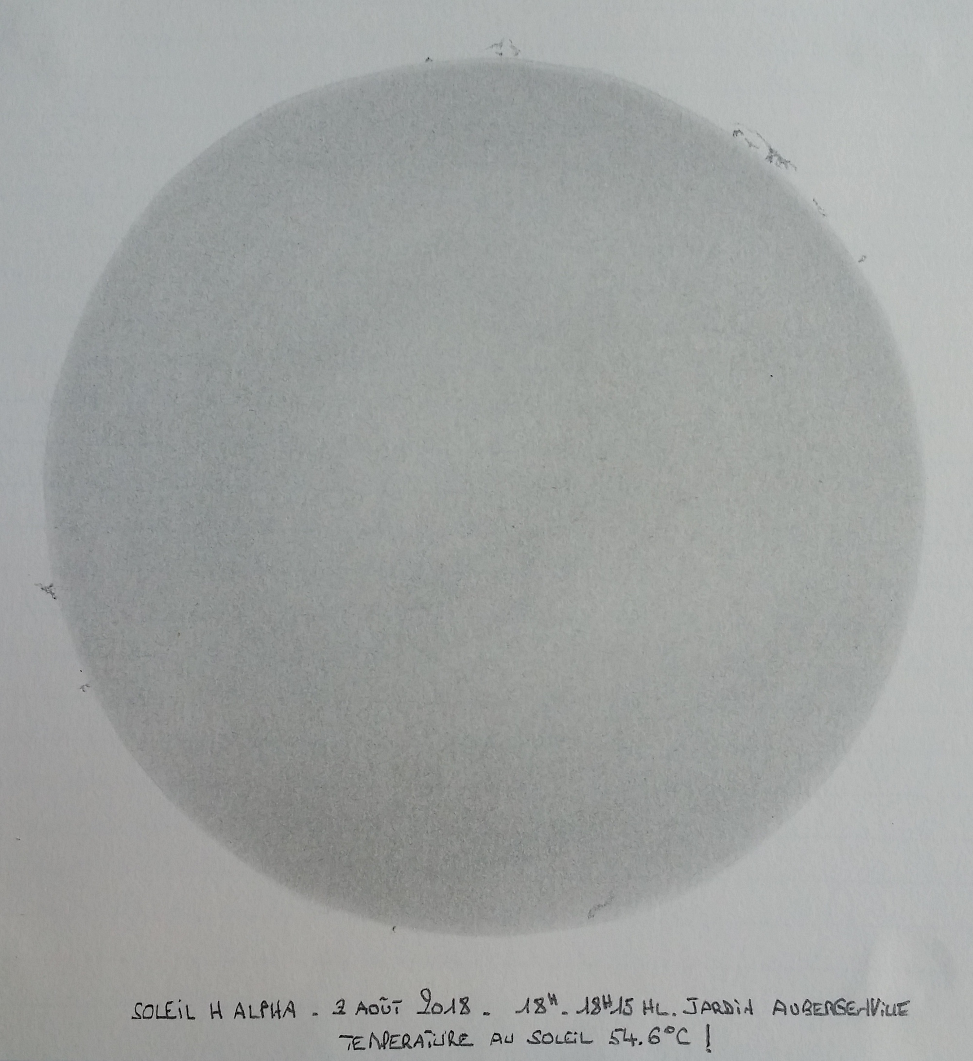 Dessin du Soleil en mode chromosphère, de samedi 4 août, derrière ma Lunt35 B600, oculaire 13 mm Hyperion.