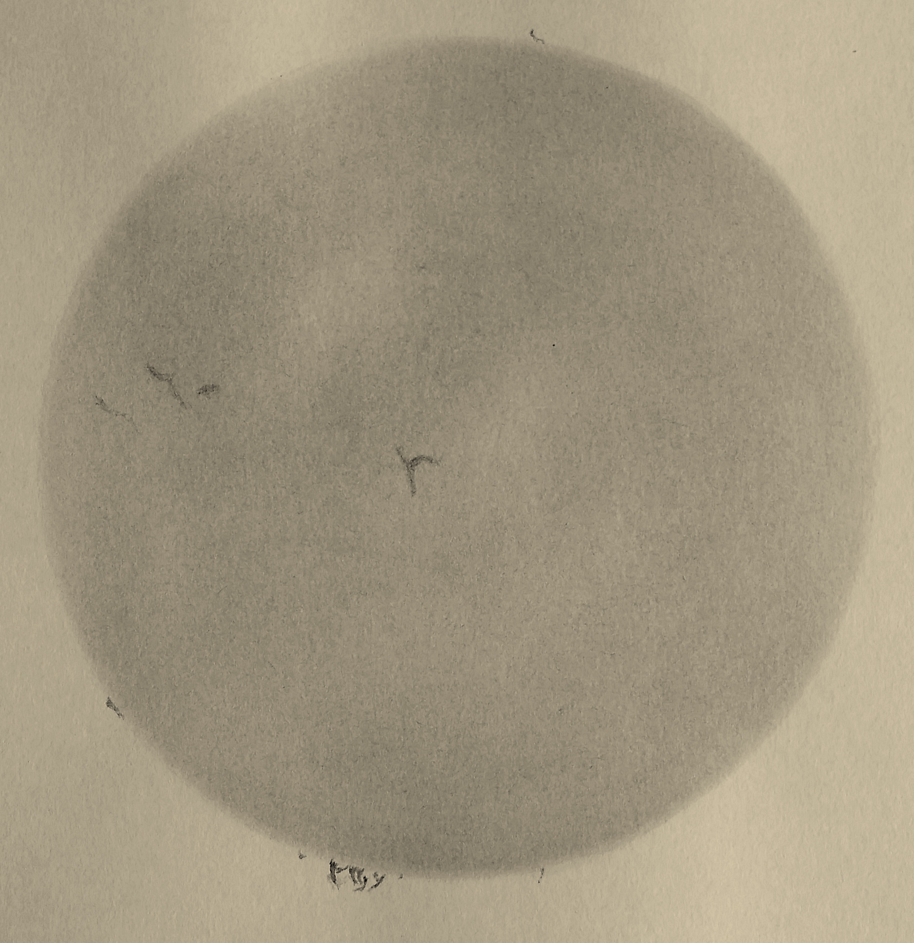 J'ai pu dessiner le 23 juin le groupe de taches AR 2715, entre 12h20 et 13h HL. Lunette 102/1000 - Gr 150x - prisme de Herschel - filtre Continuum -