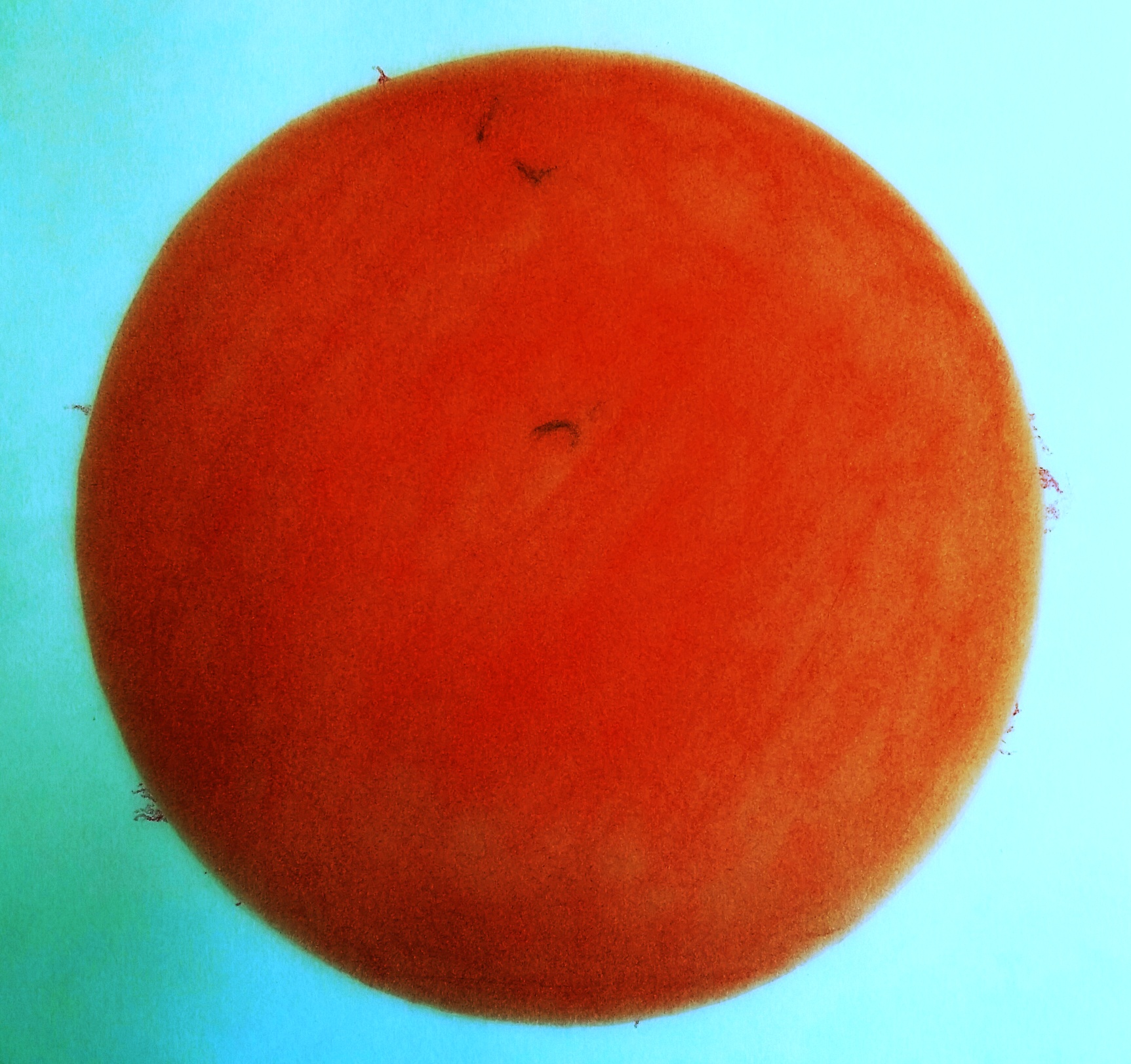 Nouveau dessin ce jour de notre Etoile favorie, avec essai de mise en valeur de la couleur de la chromosphère.