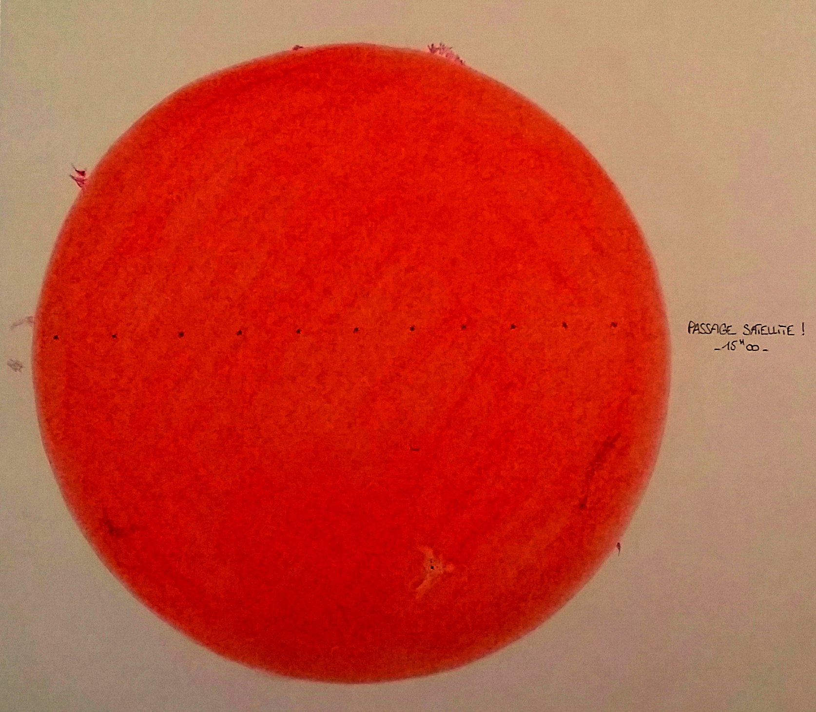 Alors que mon dessin terminé à 14h45 heure légale, j'observais à nouveau notre Astre du jour, quelle n'a pas été ma surprise, à 15h pétantes, d'assister "en live" au passage de ce que je pensais au départ être l'ISS !  Transit de probablement 2 à 3 secondes, pas plus.
