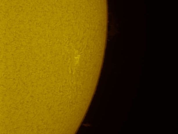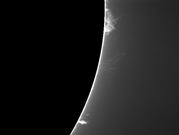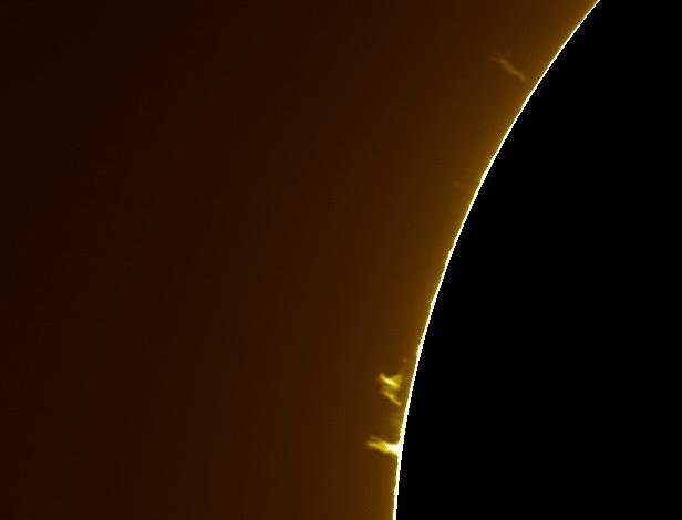 Une immense protu très ténue en forme de grue de construction ! Ah, il faut la choper celle-là ! Très faible mais bien là !  Une autre à gauche en forme de point d'interrogation. Et plus qu'une zone active en surface (ou alors je n'ai pas vu la seconde).