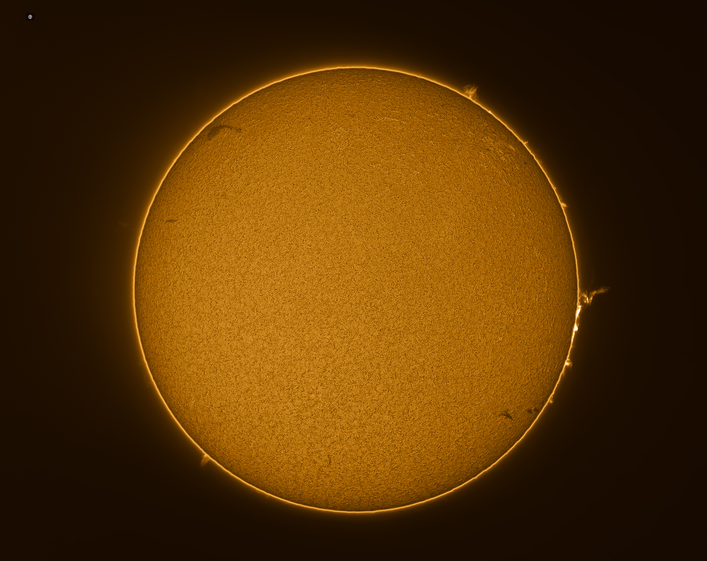 oui, c'est la concaténation de deux films : un avec juste le disque (gamma 60), l'autre avec juste les protubérances (donc le disque est saturé sur le film, avec gamma autour de 25 et un temps d'exposition plus long).