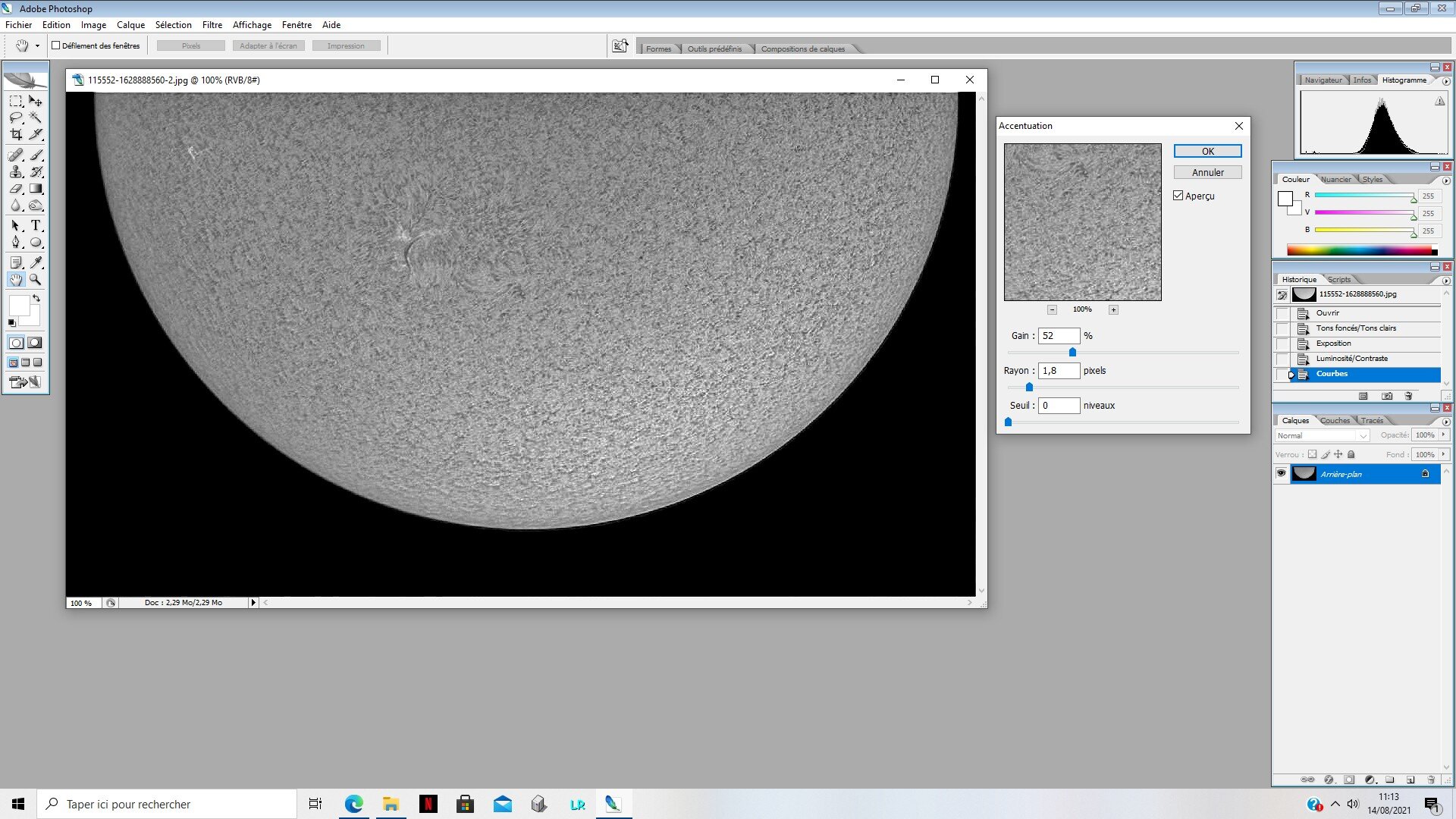 @stef41 : Merci pour les infos, si ce sont bien des interférences ça expliquerait pourquoi j'ai le cas sur la QHY174 et la QHY290! J'ai pourtant utilisé les câbles USB3 fournis avec les caméras, c'est quand même pas de bol... J'ai tenté de retraiter mes images prises avec la 174 avec la case "Row noise correction" activée sur AS3! mais ça n'a pas changé grand chose (même si ça a un peu amélioré), je vais tester le menu "Advanced" voir ce qui peut en sortir. Pour les flats j'ai lancé un sujet récemment sur le forum mais sans réponse nette et définitive : comment faire un flat solaire sur le soleil entier?  Les bords du flat sont forcément assombris donc ça ne fonctionne normalement pas! Je voulais faire un test de flats sur le ciel en faisant des poses plus longues mais je n'ai pas vu de ciel bleu depuis quelques semaines donc pas pu tester. Sinon tes images sont toujours superbes! J'ai par contre une question : ta FS60 fait 355mm de focale, et tu utilise un étalon de 40mm donc ton f/d est déjà proche de 10, donc pourquoi utilises-tu un glasspath de 1,7x? Le double stack apporte t'il un réel + en dehors d'un meilleur contraste?