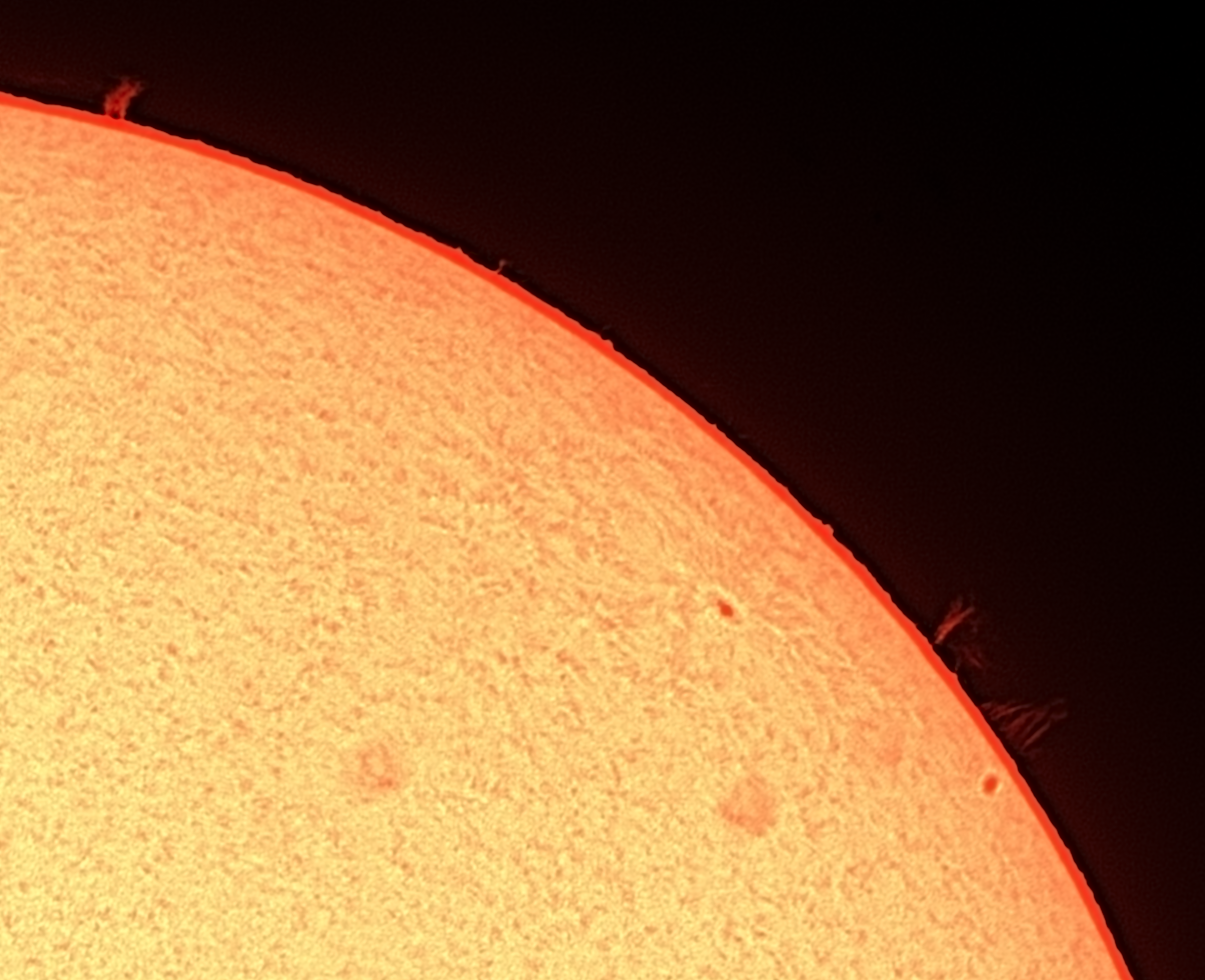 Et donc chercheur skywatcher 9x50, barlow télécentrique 3x, DayStar Quark chromo, ASI178mc en milieu de journée ce 12/11/2021. Seulement une 30aine de secondes d'images soit 736 frames et uniquement 5% gardées pour le stack, ça fait pas beaucoup... Traitement autostakkert + astrosurface + photoshop.