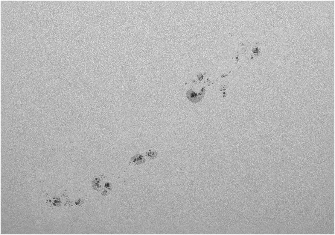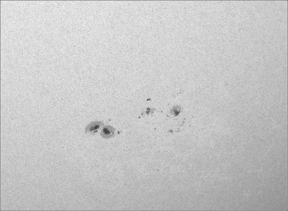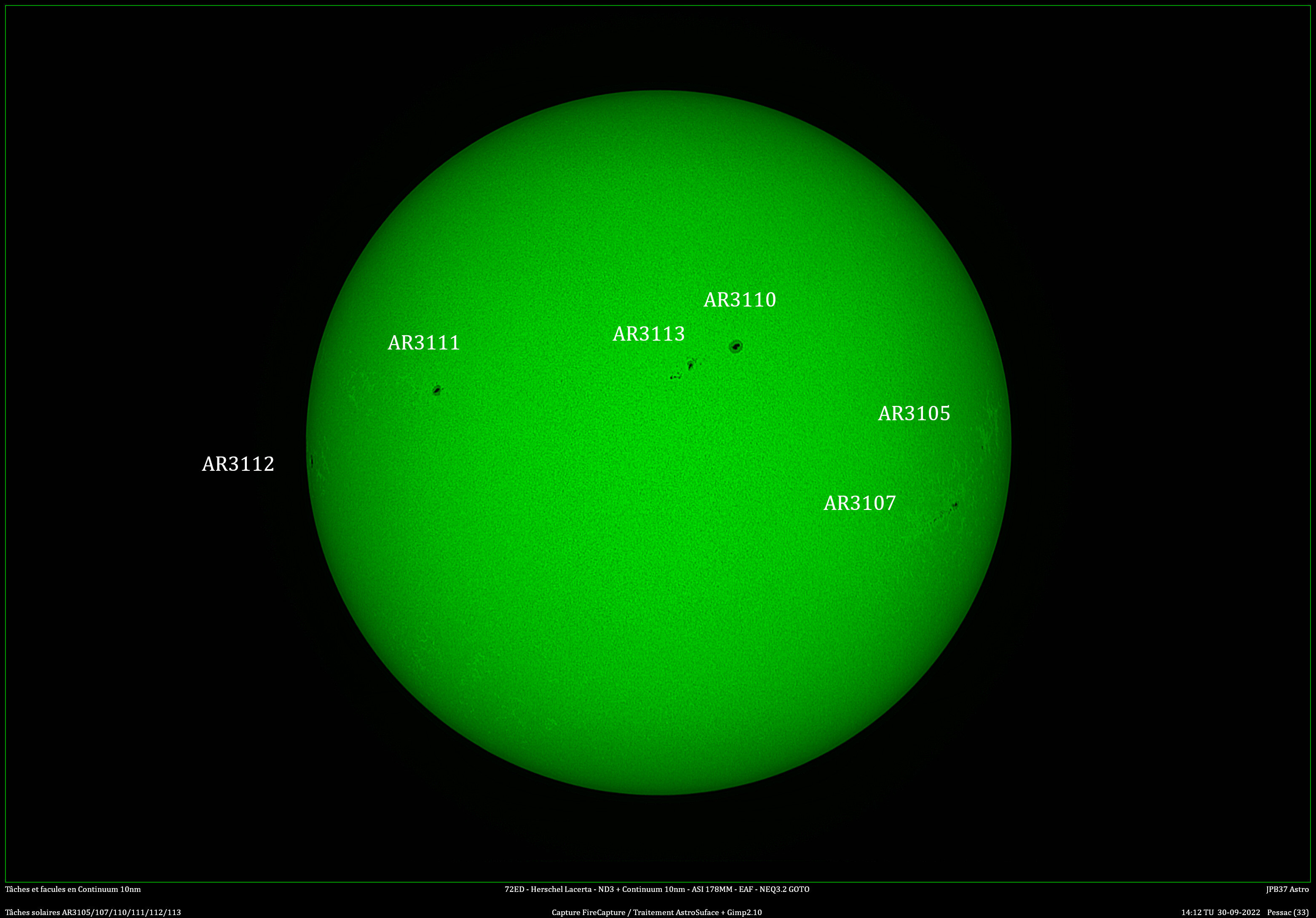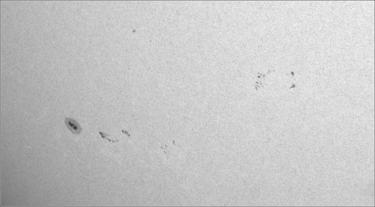 Enfin en lumière blanche (verte en fait puisque j'utilise un filtre continum) avec la lunette de 130mm et un filtre astrosolar, le portrait des taches visibles actuellement.