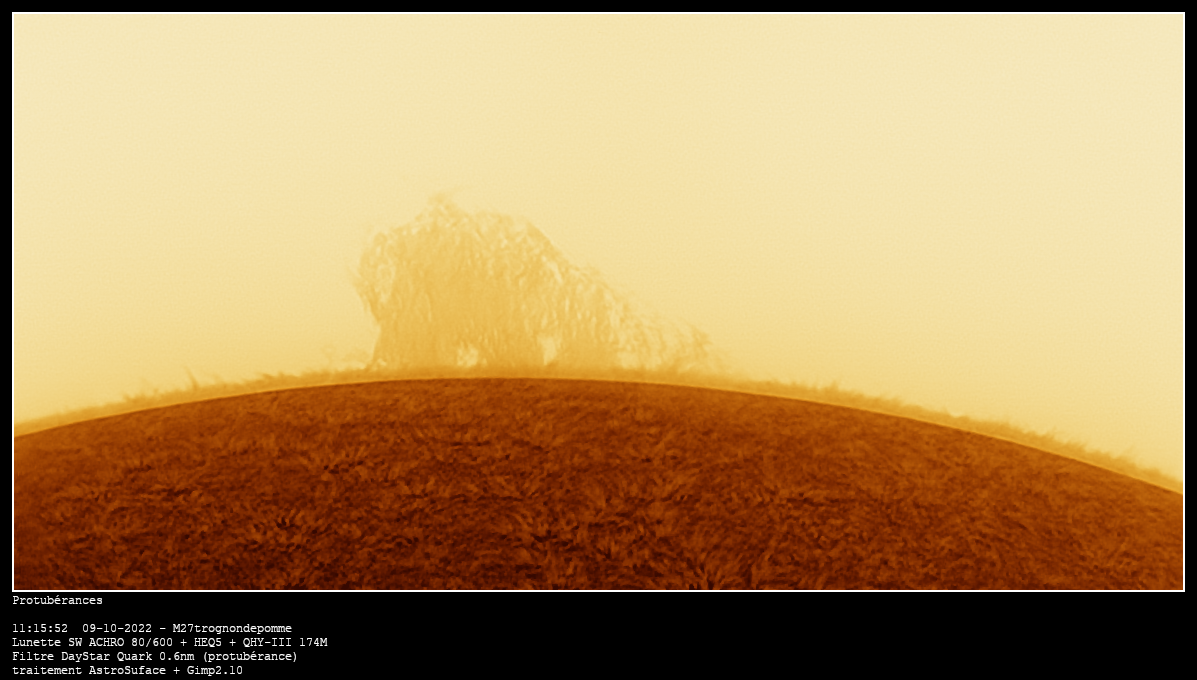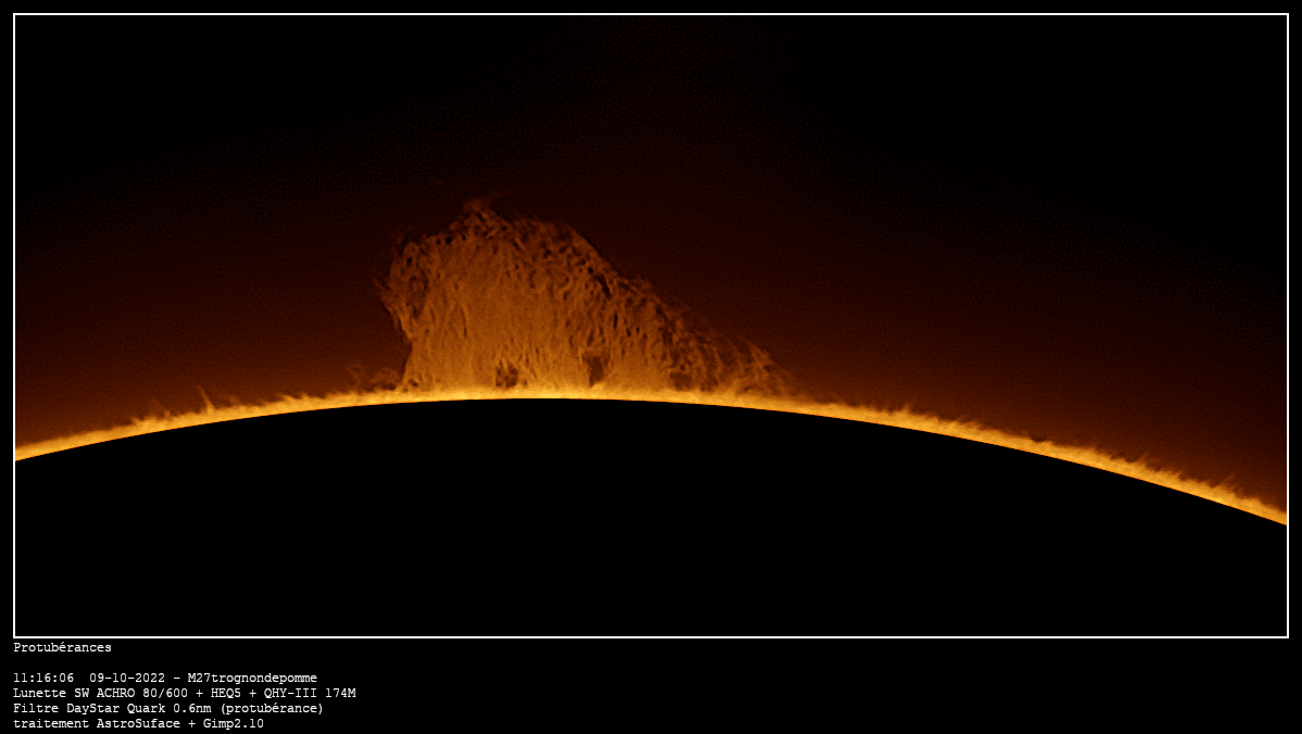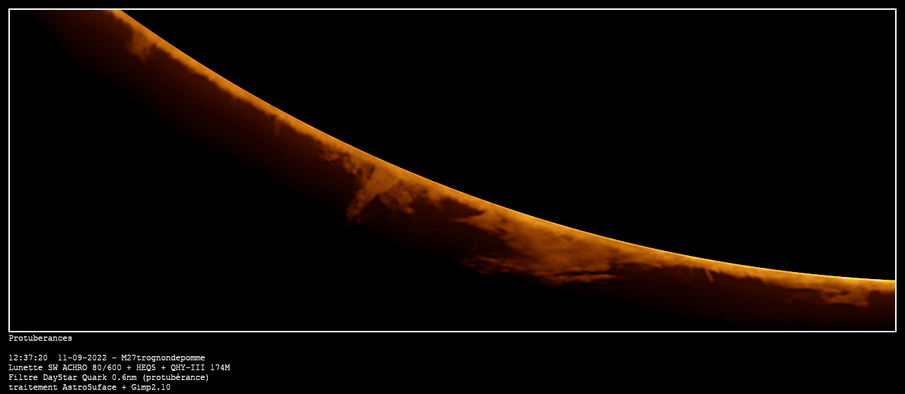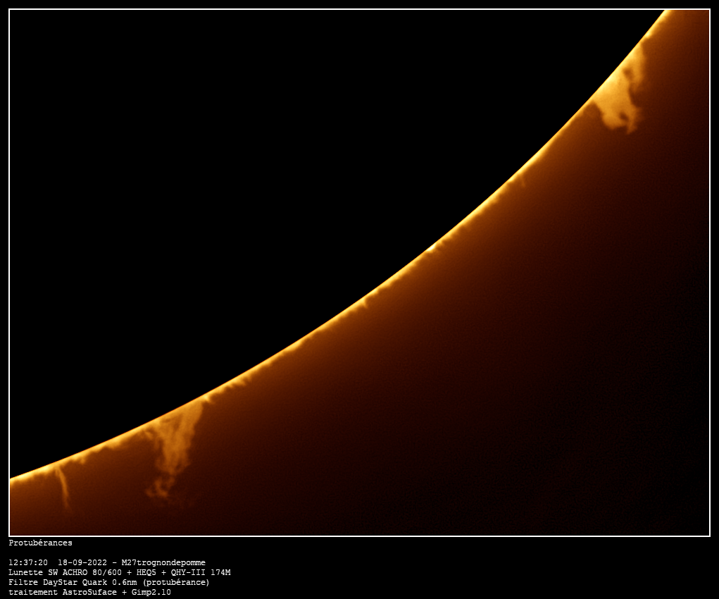 Il y a une belle protubérance peu lumineuse et à peine visible. Donc l'image suivante est un crop sur cette protu avec un temps de pose plus long et plus de gain pour la faire ressortir. Traitement façon coronographe.