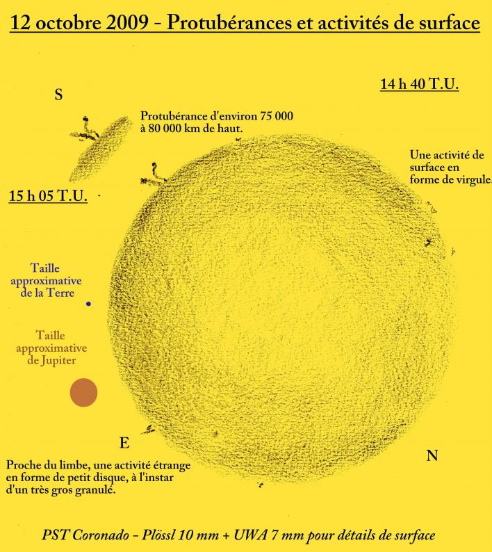 A défaut d'avoir pu observer aujourd'hui, je me suis amusé ce soir sur mon dessin d'hier de la grosse protu à insérer la taille de la Terre et celle de Jupiter (la plus grosse planète du système solaire quand même !) que je n'ai jamais vu mise ailleurs, en comparaison avec notre Etoile et la ou les protus présentes.