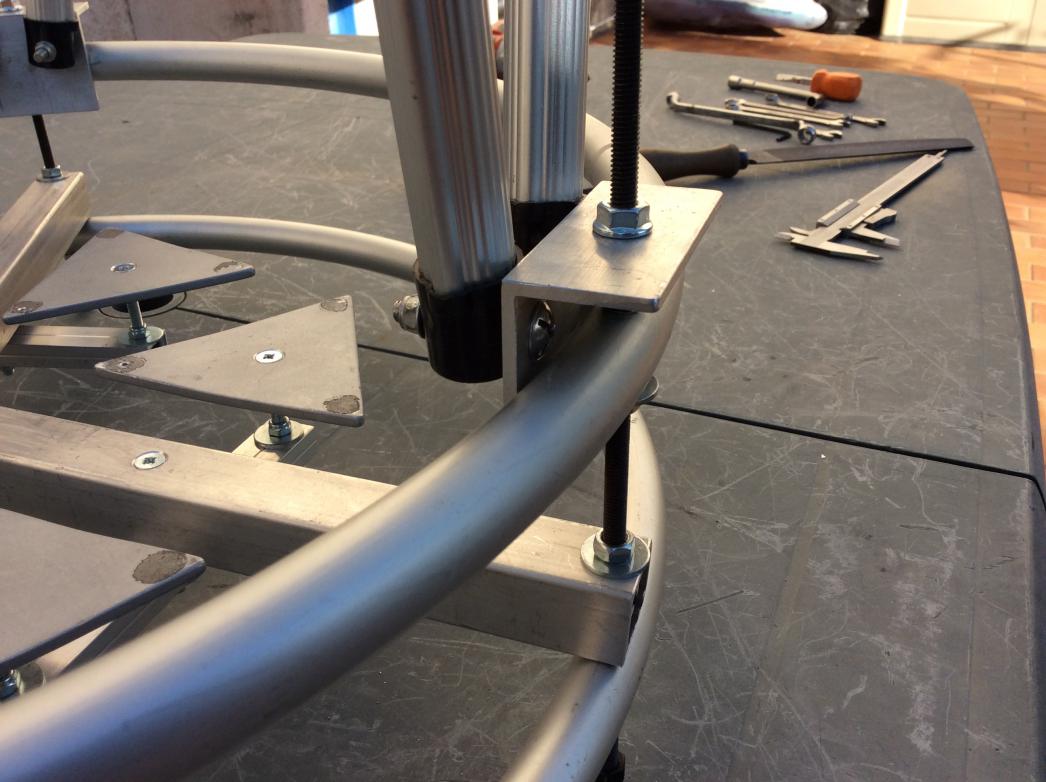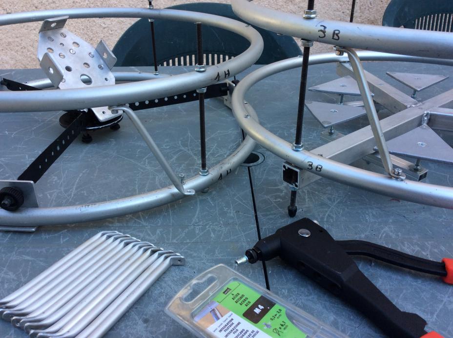 Holà , voilà un moment crucial dans le projet et c' est réussi , toutes les jambes de force et les écroué à sertir sont en place , pourquoi crucial ... pourvoir le démonter et le remonter entièrement , pour cela tous les positionnements des écrou à sertir doivent être rigoureusement identiques , ensuite les jambes de triangulations doivent elles aussi avoir la même taille , les mêmes angles et les perçages entreaxes pour le vissage aussi et pour ne pas avoir à tous numéroté ils sont tous interchangeables