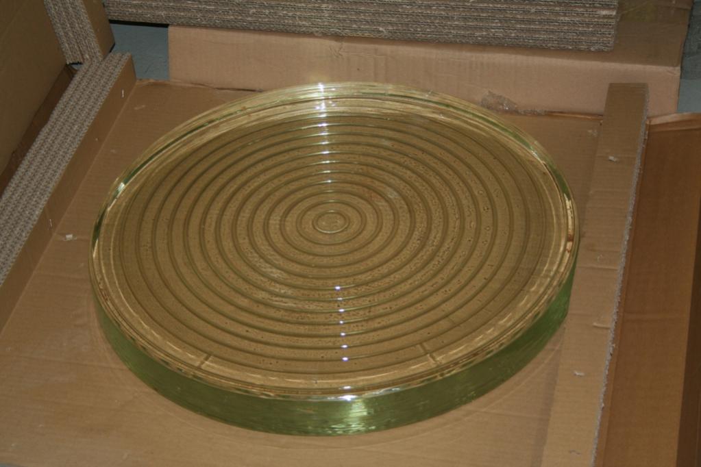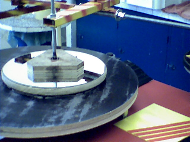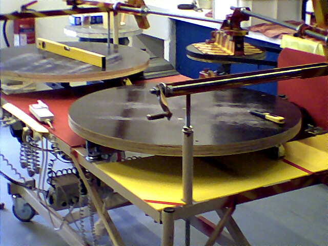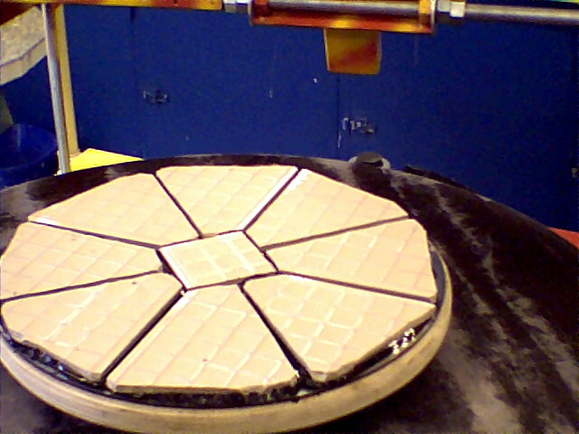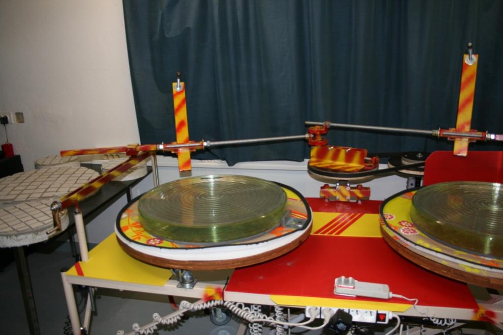 du coup fabriquation d'un outil, pour les rectifier ,contituer par un disque de contreplaqué de 400mm et 26 mm d'épaisseur, pris en sandwich entre deux disques de verre pour avoir un base bien plate, ou sont glanté des carreaux de grés cérame au ciment d'opticiens(poix et cire )