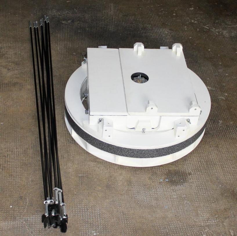 En ce qui concerne la base annulaire, il ne faut surtout pas penser la placer directement sur le sol. Tu ne trouveras jamais un sol assez rigoureusement plat pour ta base. Par contre, il faut mettre 3 pieds dessous, que tu pourras bien enfoncer dans le sol (si c'est de la terre ou de l'herbe), de manière à ce que cela soit bien stable.