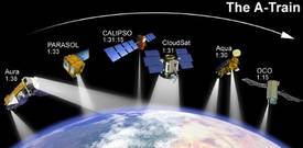 Première mondiale, l'A-Train est une constellation de six satellites franco-américains qui volent en formation à quelques minutes d'intervalle sur une orbite héliosynchrone et passent au-dessus de l'équateur à 13:30 locales.
