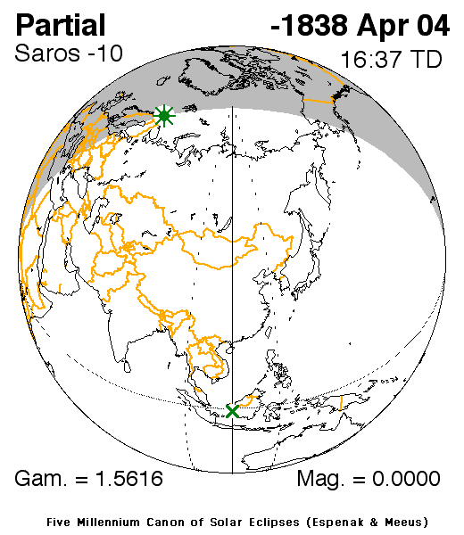 ● l'éclipse partielle de Soleil du 4 avril -1838 a eu une grandeur maximum de seulement 0,00002 ; ce qui veut dire que seulement deux cent-millièmes du disque du Soleil ont été cachés par le disque de la Lune. Cette toute petite éclipse partielle de Soleil fut visible au Nord de la Norvège.