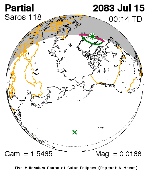 ● Eh bien, l'éclipse partielle de Soleil du 15 juillet 2083 aura une grandeur maximum de seulement 0,01686 ; ce qui veut dire que seulement 16,86 millièmes du disque du Soleil seront cachés par le disque de la Lune. Cette très petite éclipse partielle de Soleil sera visible dans le Sud-Est du Groenland.