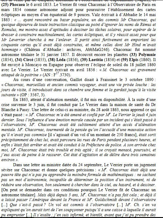 La notice concernant Chacornac dans le livre de Véron est incroyable de méchanceté : "dépourvu de toute instruction" ;), "pauvre diable d'astronome" ;). A lire absolument par les quizzeurs. Après cela, on est en droit de se méfier de toutes les pseudo-vérités véhiculées par des documents privés qui ont été réunis par des historiens de l'astronomie comme Philippe Véron.