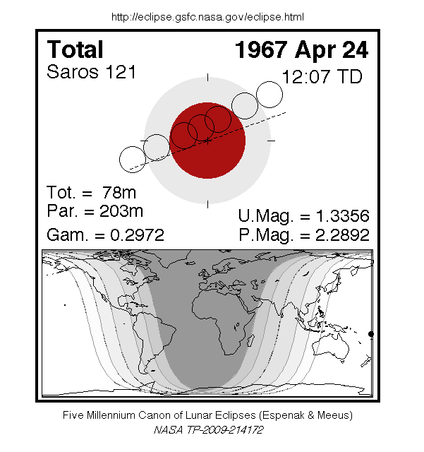 Effectivement, le lundi 24 avril 1967 devait se produire sur Terre une éclipse totale de Lune. C'était précisément l'éclipse totale de Lune n° 4910 mentionnée à la page 374 du Canon der Finsternisse” de Theodore von Oppolzer publié à titre posthume, à Vienne, en Autriche-Hongrie en 1887 [voir : "]http://www.archive.org/stream/canond.../374/mode/1up].