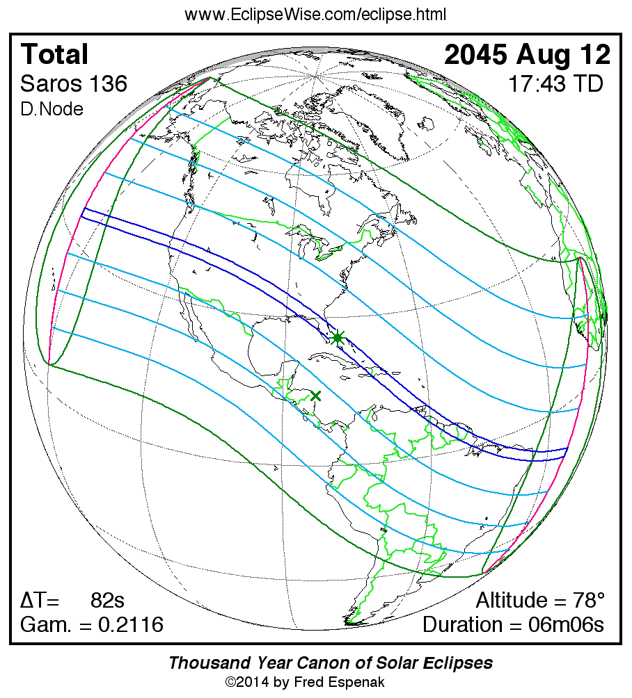 Ensuite, ce sera le samedi 12 août 2045 que la bande de centralité d’une éclipse totale de Soleil traversera de nouveau la totalité du territoire des États-Unis entre les côtes de l'Océan Pacifique et celles de l'Océan Atlantique.