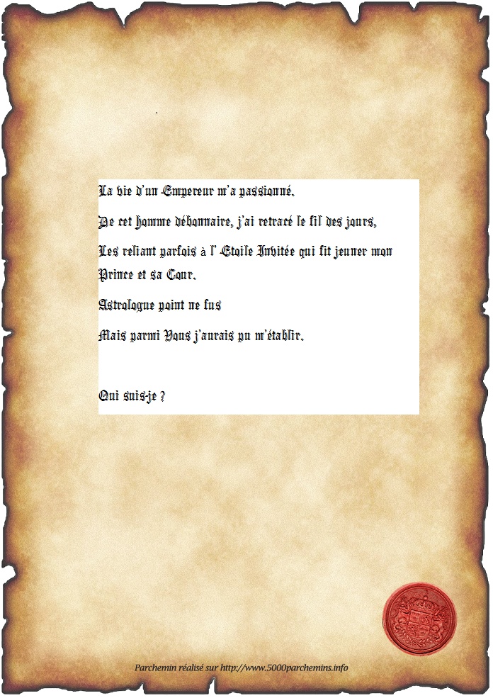 Vu que ton énigme était rédigée en caractères gothiques, j'ai pensé que le “grand empereur” n'était autre que Charlemagne. Son biographe était Éginhard (voir : https://fr.wikipedia.org/wiki/%C3%89ginhard). Il a raconté la vie de Charlemagne dans un ouvrage intitulé “Vita Karoli Magni” (“Vie de Charlemagne”), voir : https://fr.wikipedia.org/wiki/Vita_Karoli_Magni.