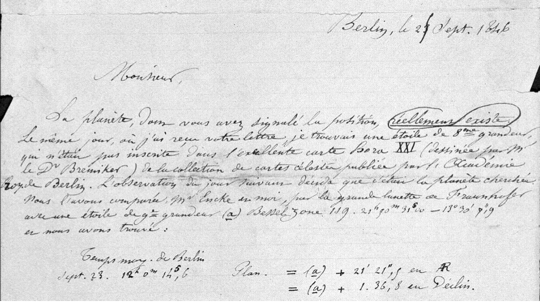 le 23/9/1846 Urbain Le Verrier écrivit à Johann Gottfried Galle en réponse à la thèse que ce dernier lui avait envoyé un an plus tôt !