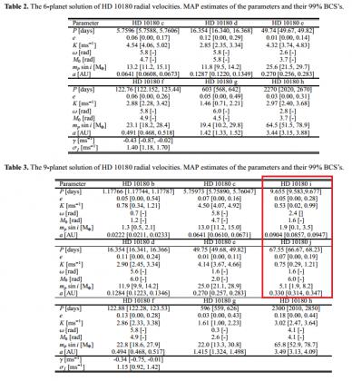 Un petit tableau vite fait résumant les caractéristiques des planètes de ce système, selon les deux solutions possibles (6 ou 9 planètes), les nouvelles encadrées en rouge: