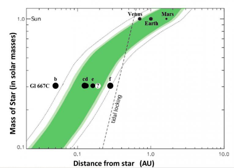 Vous vous rappelez de Gliese 667C? Cette naine rouge dans un système ternaire, accompagnée de deux planètes dont une potentiellement habitable? Une nouvelle analyse des données de HARPS donne en tout 5 planètes possibles (dont trois dans la zone habitable) plus un signal correspondant à une harmonique de la rotation de l'étoile de 53 jours:
