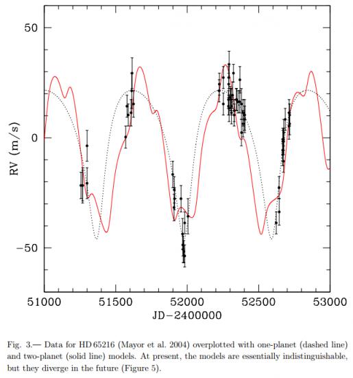 EDIT: après coup je pense pouvoir saisir l'idée, une planète sur une orbite circulaire donne une courbe sinusoïdale (des variations de vitesses radiales de l'étoile), une planète sur une orbite excentrique doit donner une sinusoïde déformée. A vu de nez et en jouant un peu sur les résonnances, deux planètes sur des orbites circulaires devraient pouvoir s'ajouter pour former une sinusoïde déformée.