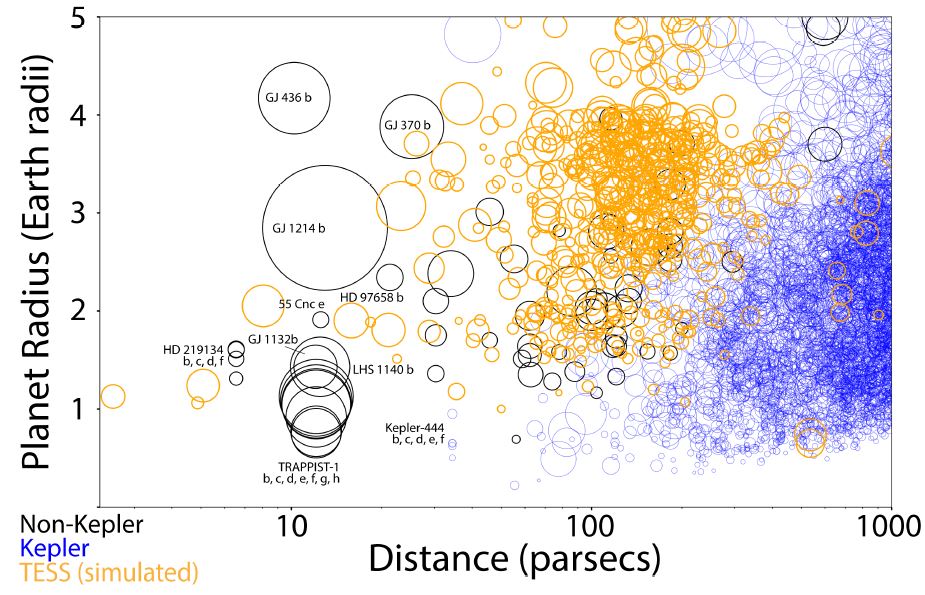 Sur cette figure, en bleu les planètes découvertes par KEPLER, en orange celles que les simulations prédisent pour TESS : elles sont beaucoup plus proches de la Terre