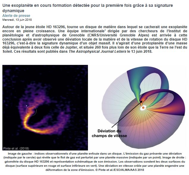 Deux équipes distinctes d’astronomes ont utilisé ALMA pour dénicher des indices probants de l’existence de trois jeunes planètes autour de l’étoile HD 163296. L’utilisation d’une toute nouvelle méthode de détection planétaire leur a permis d’identifier trois perturbations au sein du disque de gaz qui encercle la jeune étoile : ces perturbations constituent la preuve formelle de la présence de planètes nouvellement nées. Il s’agit là des toute premières planètes détectées au moyen d’ALMA