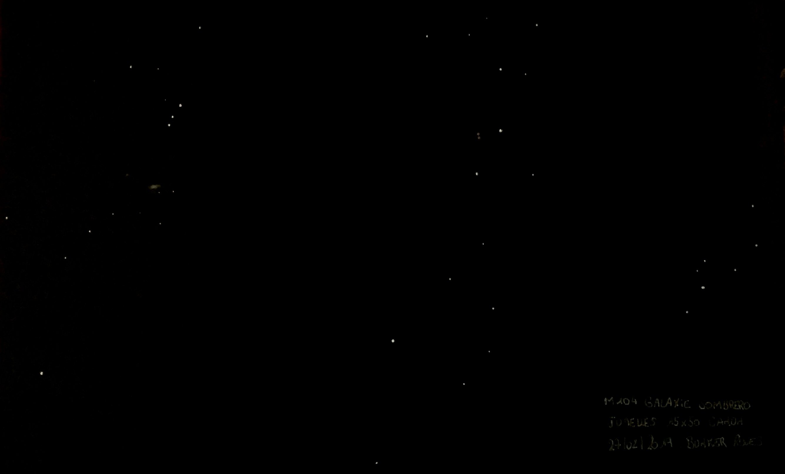 Je termine enfin sur le Sombrero toujours au Nagler pour y desceller quelques petits détails M104 est très ovalisée et se termine presque en pointe de chaque cotés, la partie Nord (En bas) semble plus arrondie que la partie Sud de cette galaxie, je note un noyau bien lumineux :]