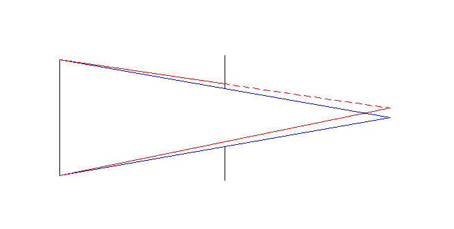 J’ai fait un petit schéma pour illustrer l’effet d’un diaphragme placé à mi chemin entre l’objectif et le foyer, et qui laisse juste passer le cône de lumière dans l’axe de l’instrument (rayons bleus). On voit que pour un détail excentré (rayons rouges), toute la lumière n’arrive pas au foyer, mais le vignetage est vraiment minime. Le dessin n’est pas à l’échelle, c’est juste pour comprendre.