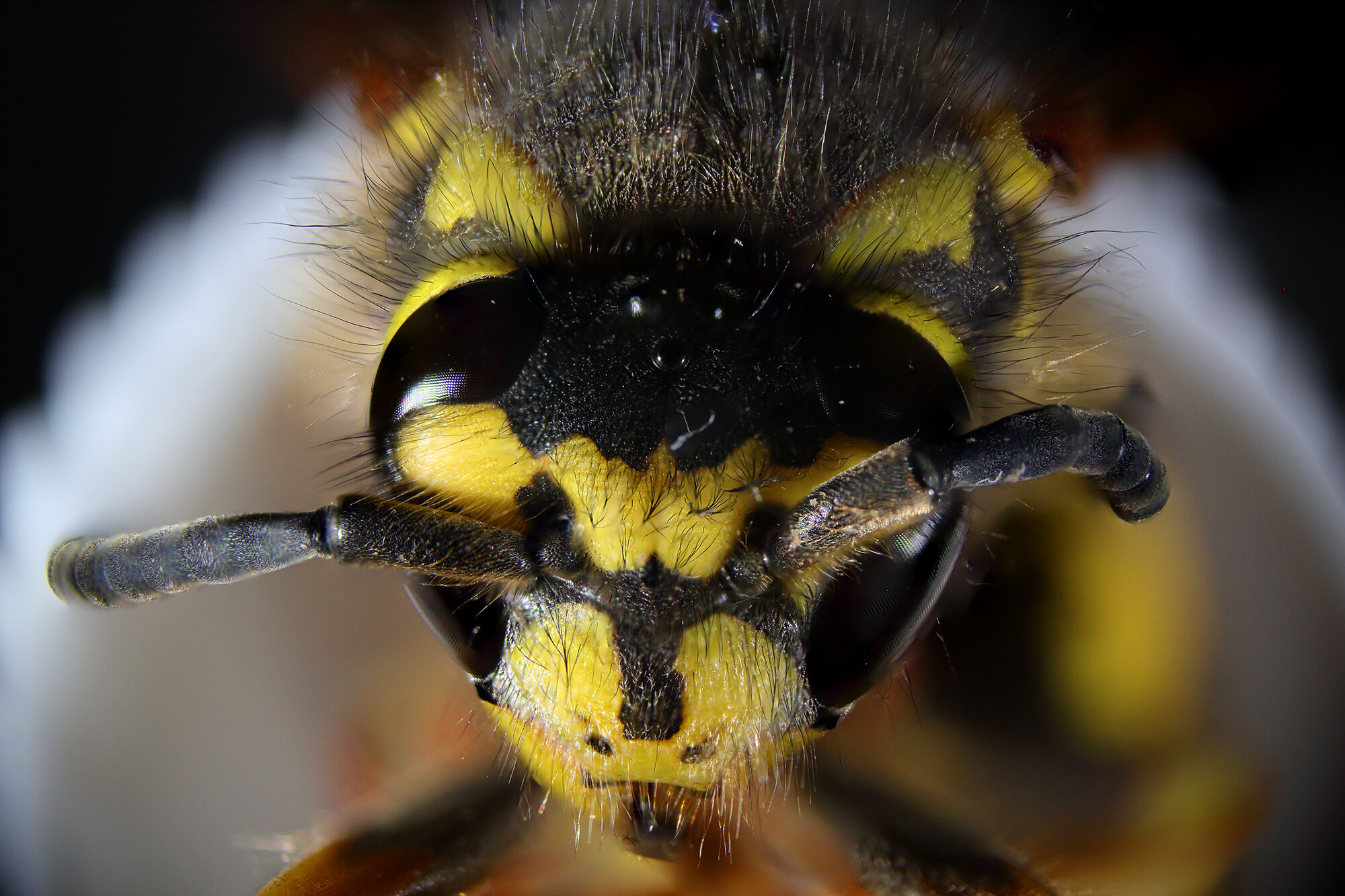 Voici la tête de madame La Guêpe ou Abeille ? mais là le sujet est beaucoup plus "gros" que le moustique et du coup je trouve que ça relève plus de la macro photographie car avec la loupe bino ou bien le microscope, ça manque trop de profondeur de champ et du coup le stacking bug avec trop d'artéfacts je trouve.
