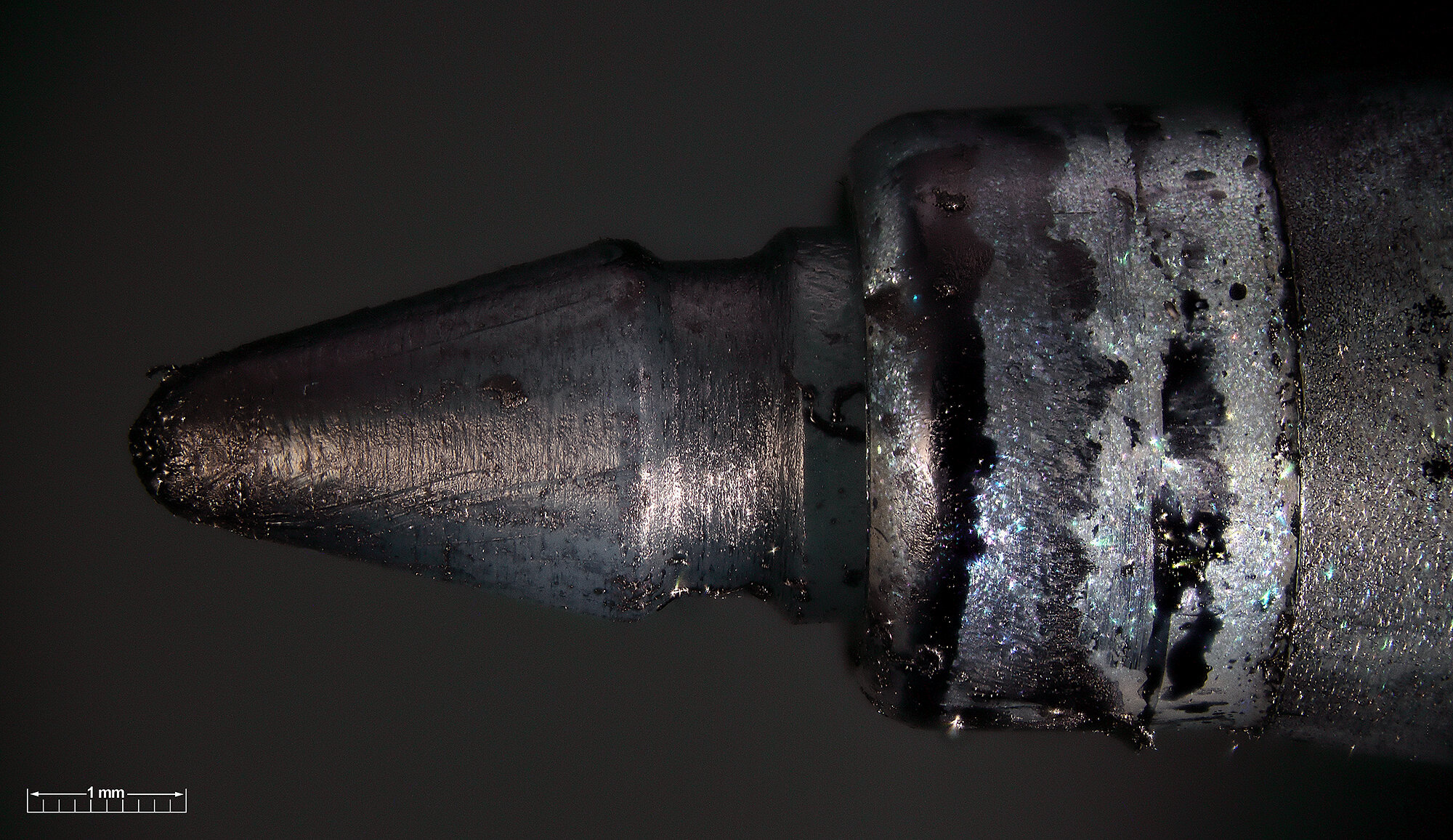 La pointe d'un stylo de marque bien connue qui commence par un "B" au microscope x10 :