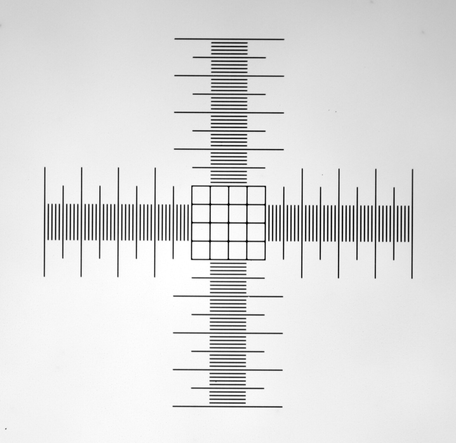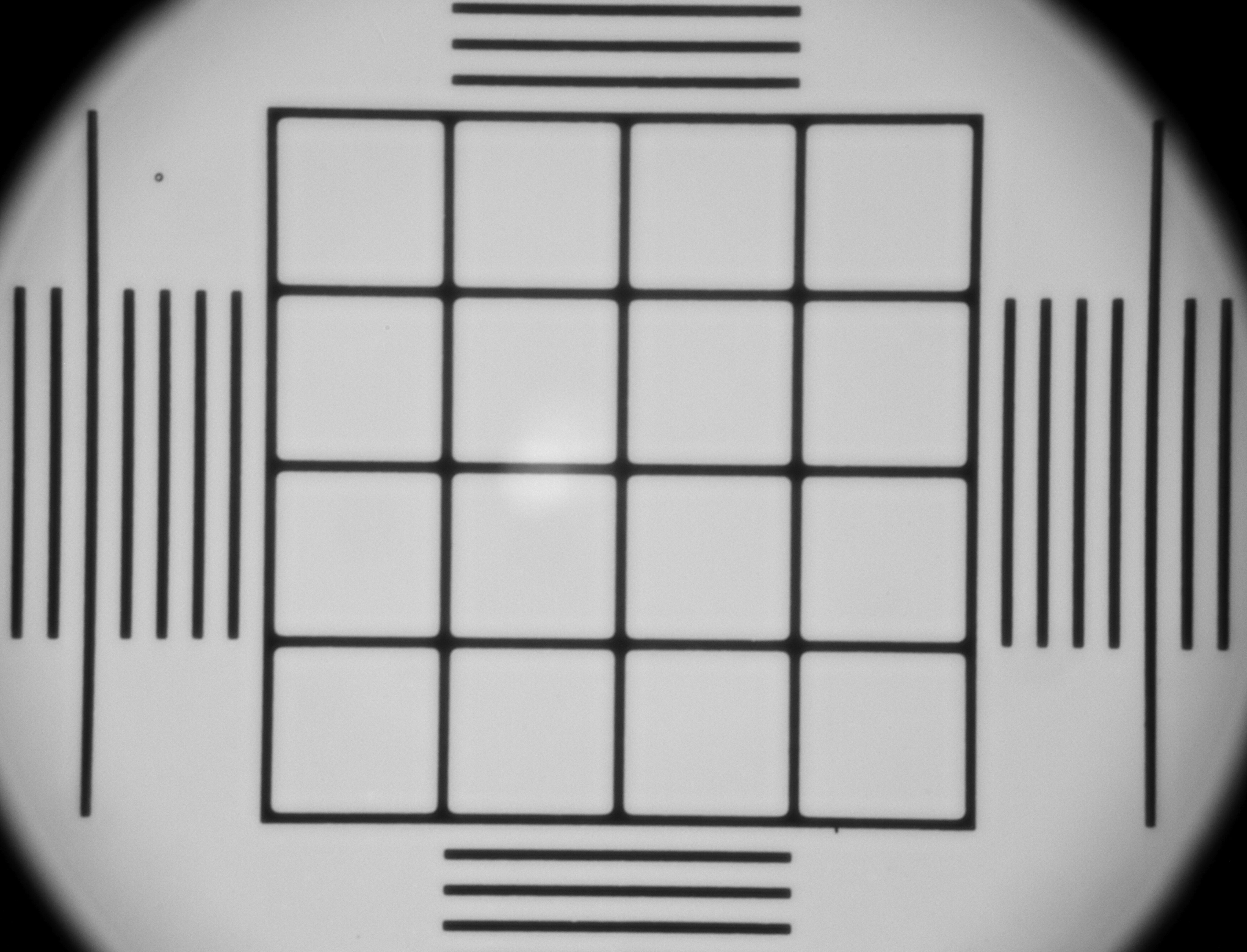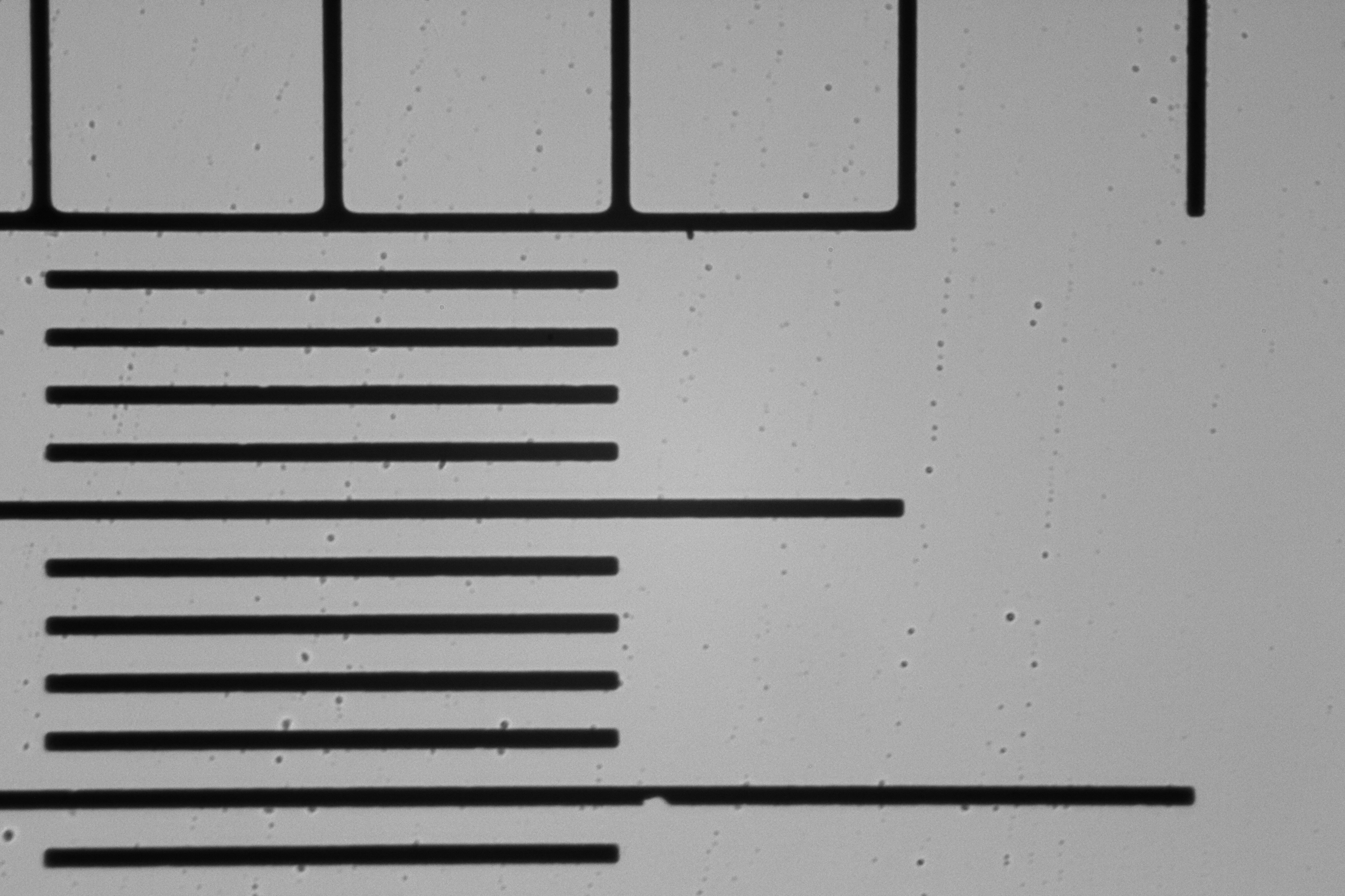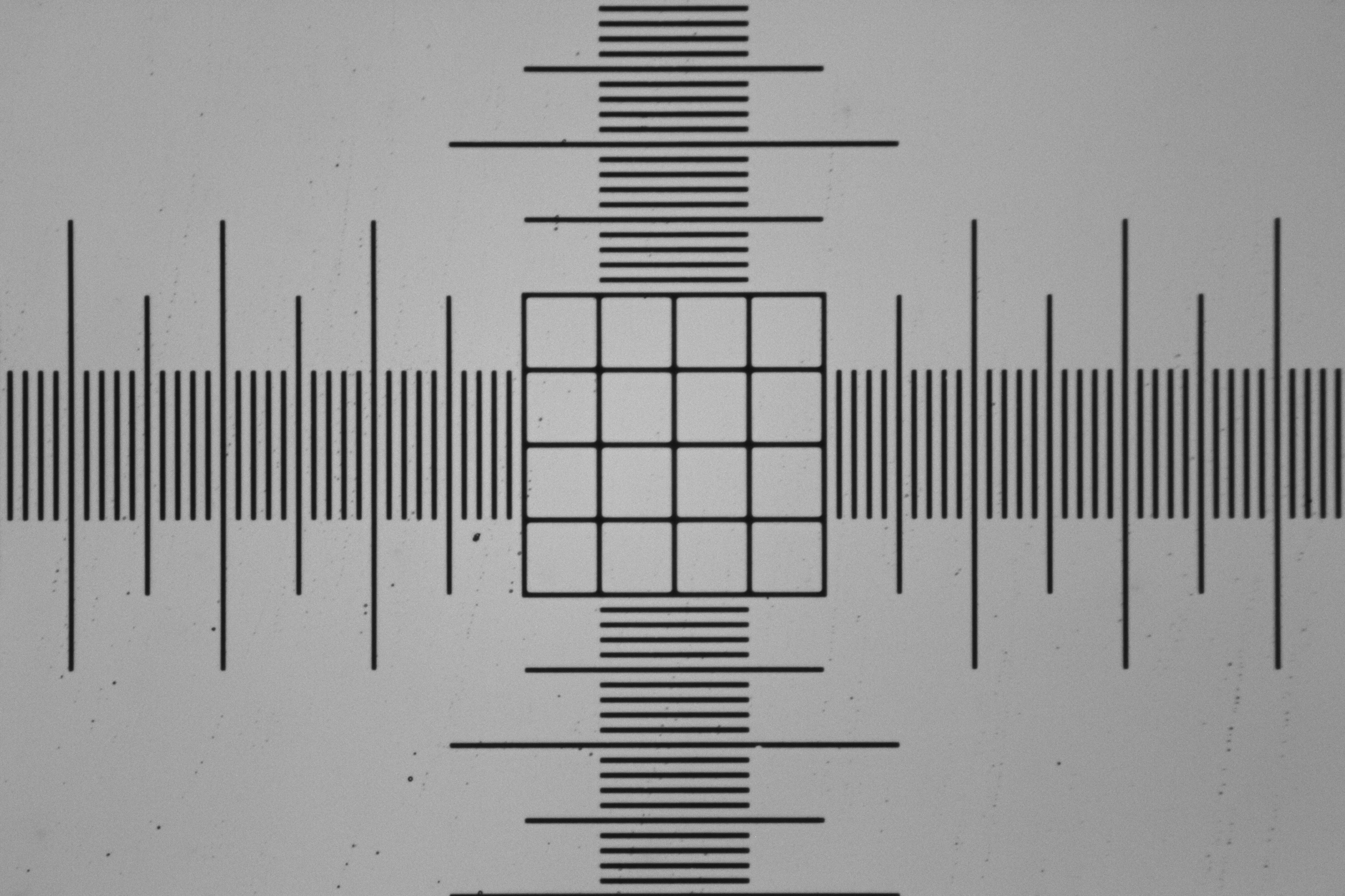 J'ai reçu la lame de calibration hier et je l'ai photographiée avec les objectifs :   x4 / 10x / 40x / 100x   sans aucune correction lors du développement excepté d'avoir transformer le RVB et niveau de gris et recadré au plus serré du centre de la mire "1 DIV = 0.01 mm" de la lame de calibration :
