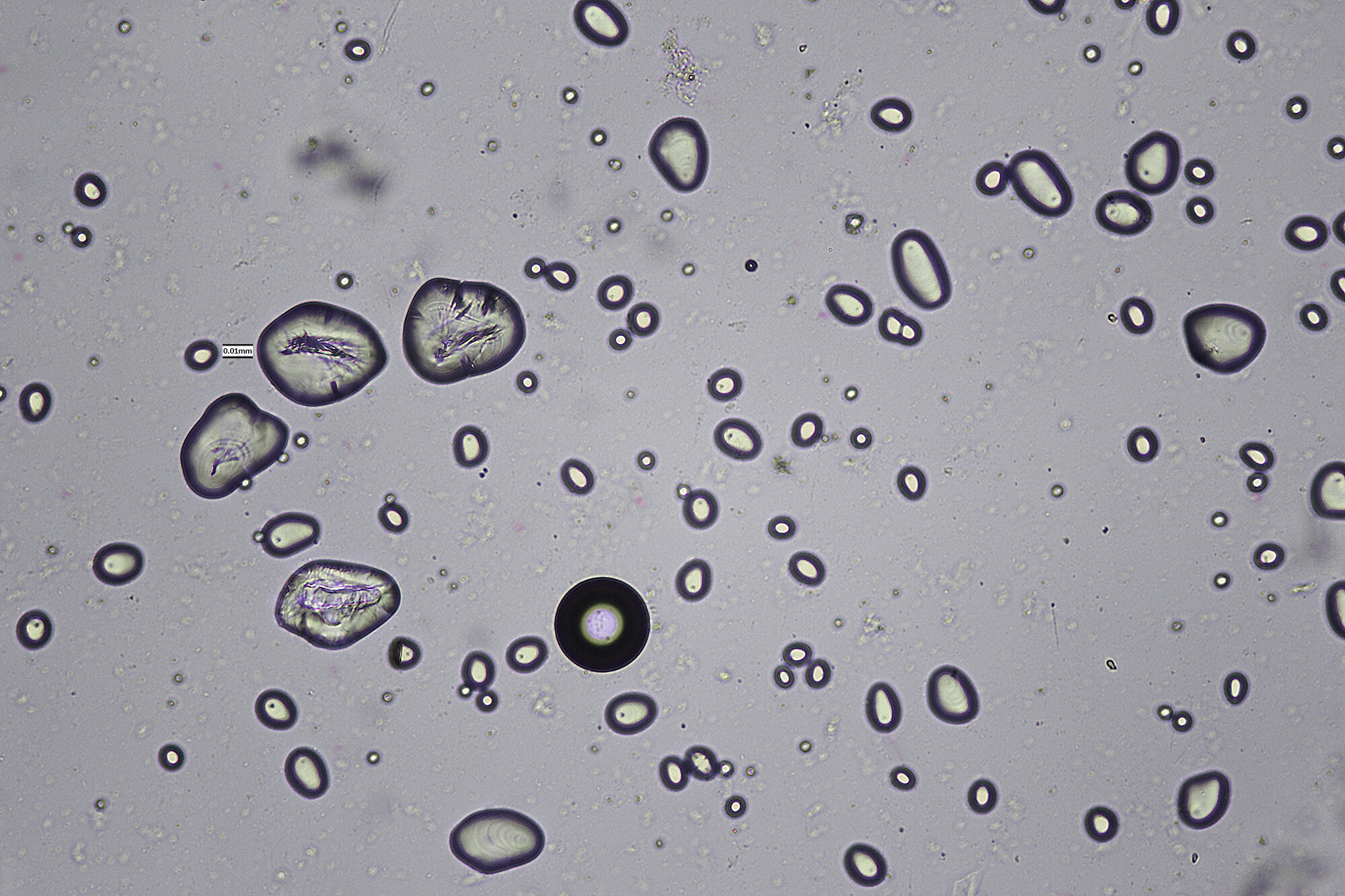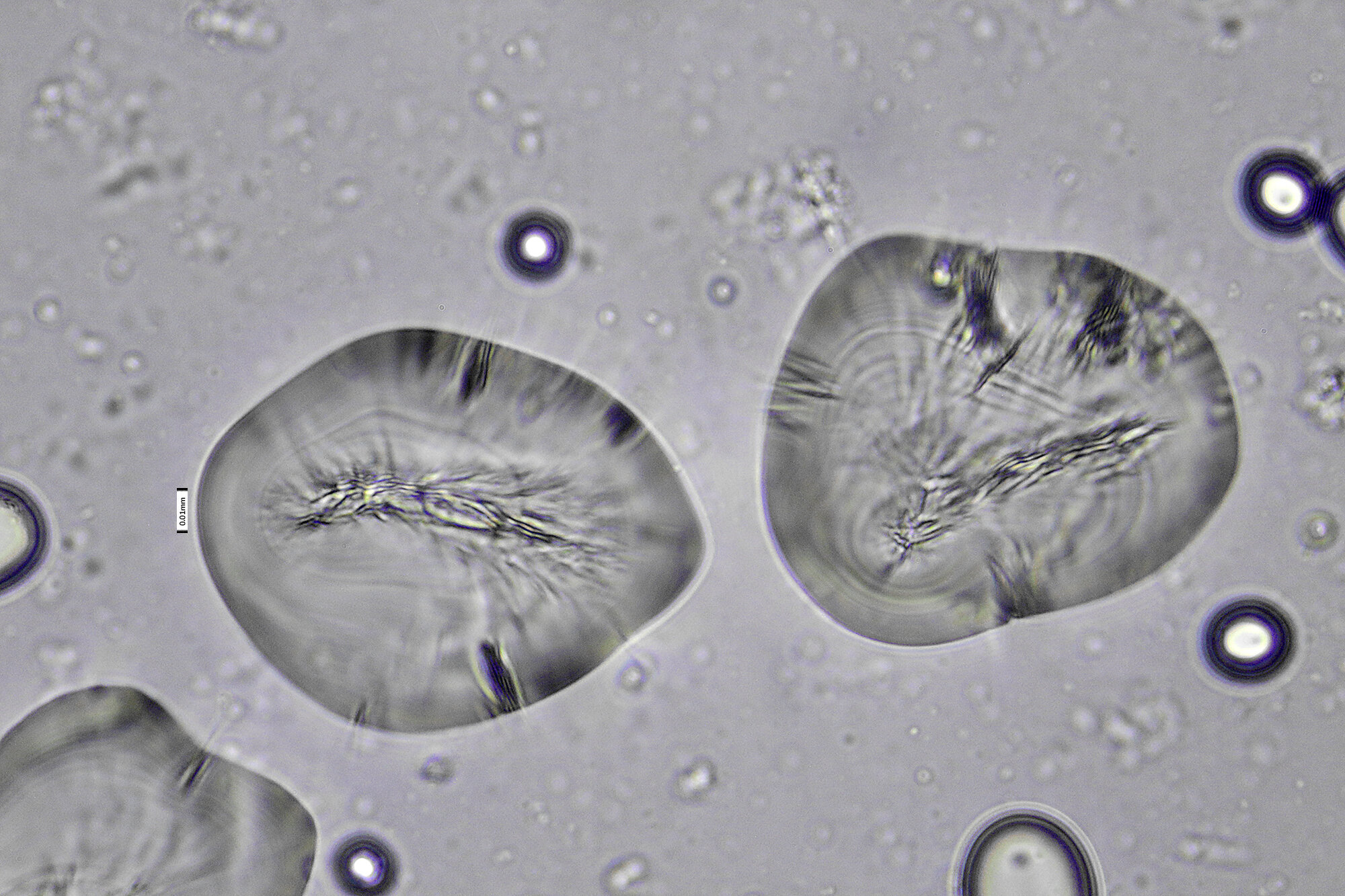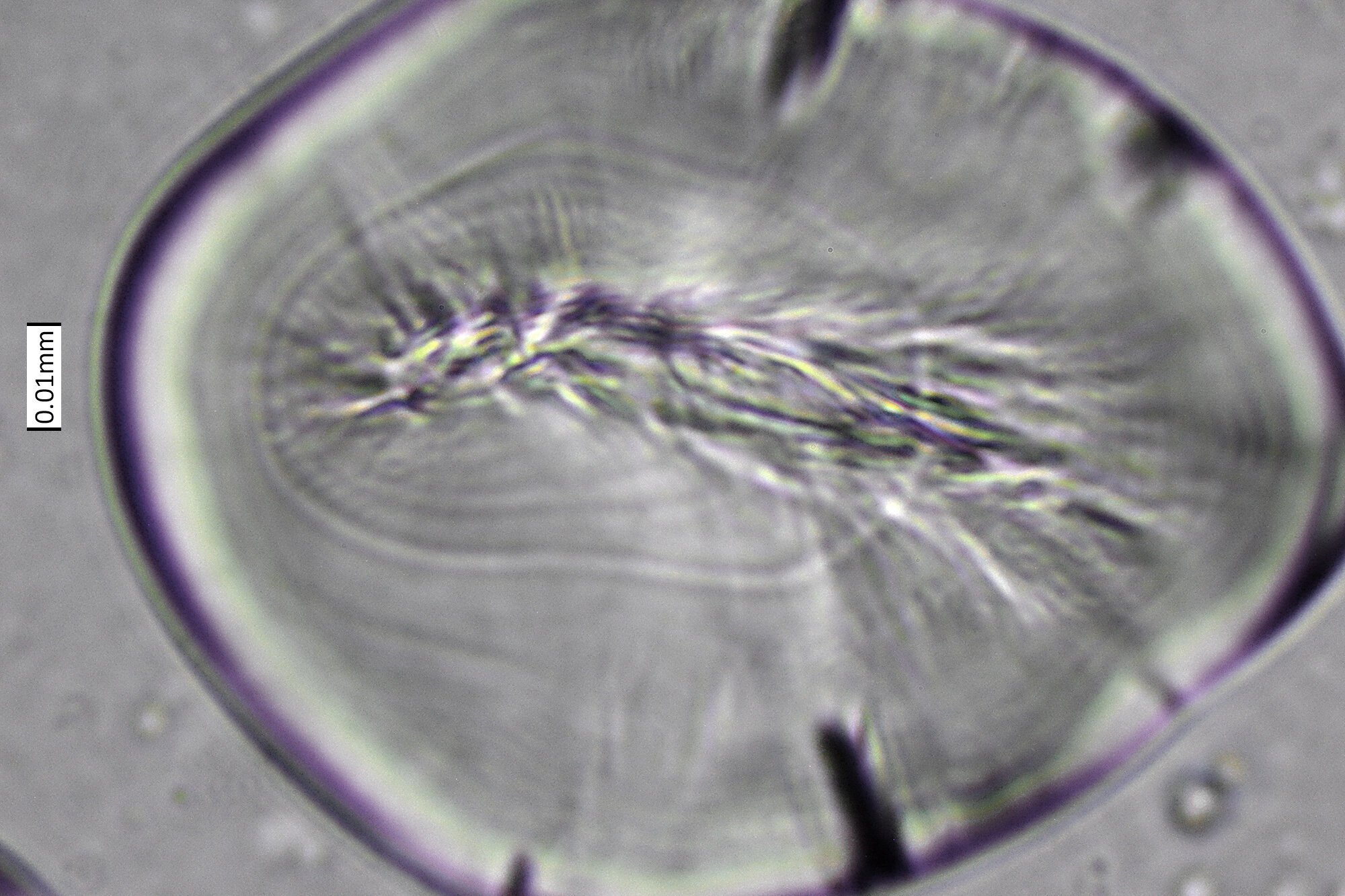 Je ne sais pas ce que l'on voit au milieu de la cellule et qui semble être à l'intérieur ? mais je me suis dit au moins y a quelque chose à voir :) par contre, les stries que j'ai pris au début pour des anneaux de newton sont apparemment des strates d'amidon qui se sont accumulées.