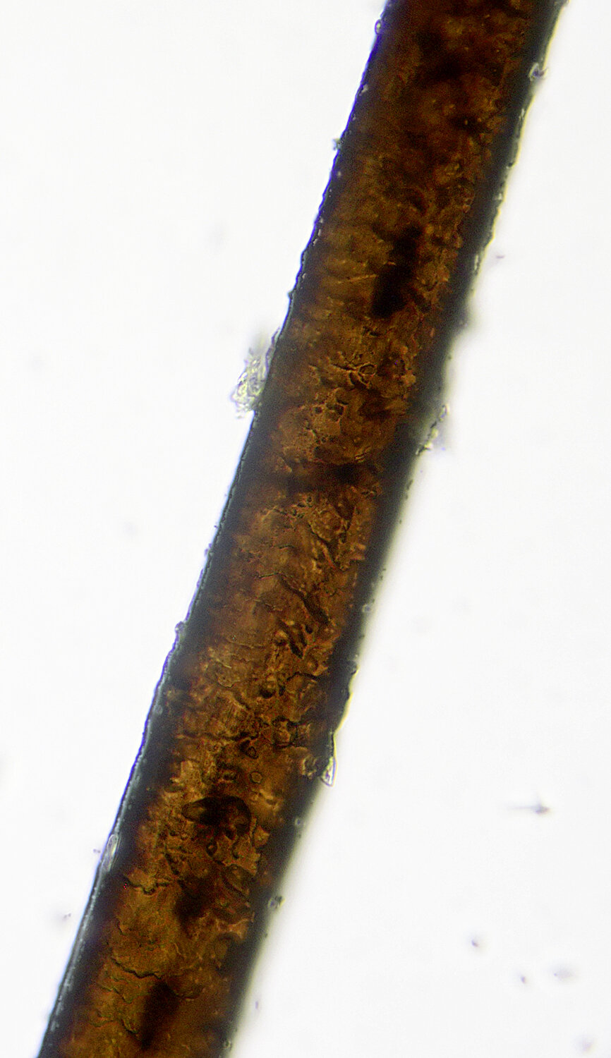Voici un cheveux avec l'objectif 10x et le montage n°1 du post précédent (ça grossissait vraiment trop avec le n° 2) :