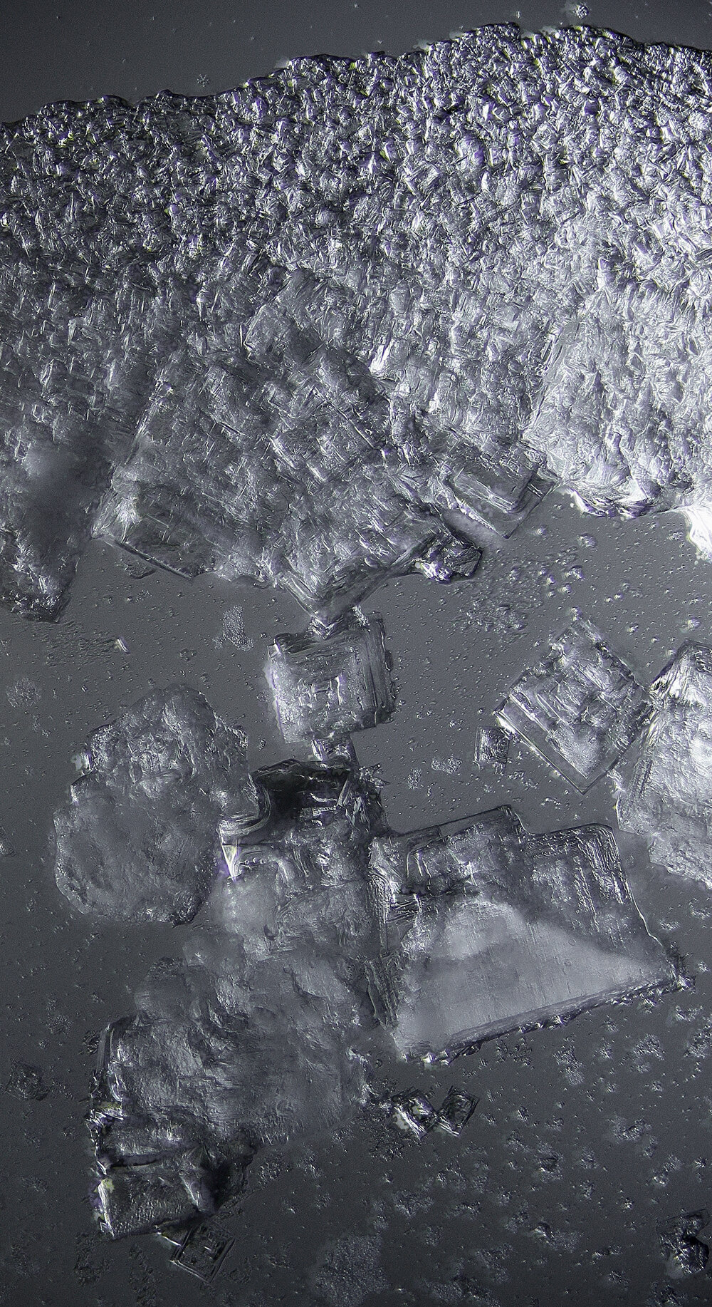 D'ailleurs, en faisant des tests, j'avais complétement déréglé le condenseur qui n'était plus du tout centré dans le champ, et bien ça a fait comme si la lumière était oblique ou décalée, ce qui à donné ceci sur des cristaux de sels :