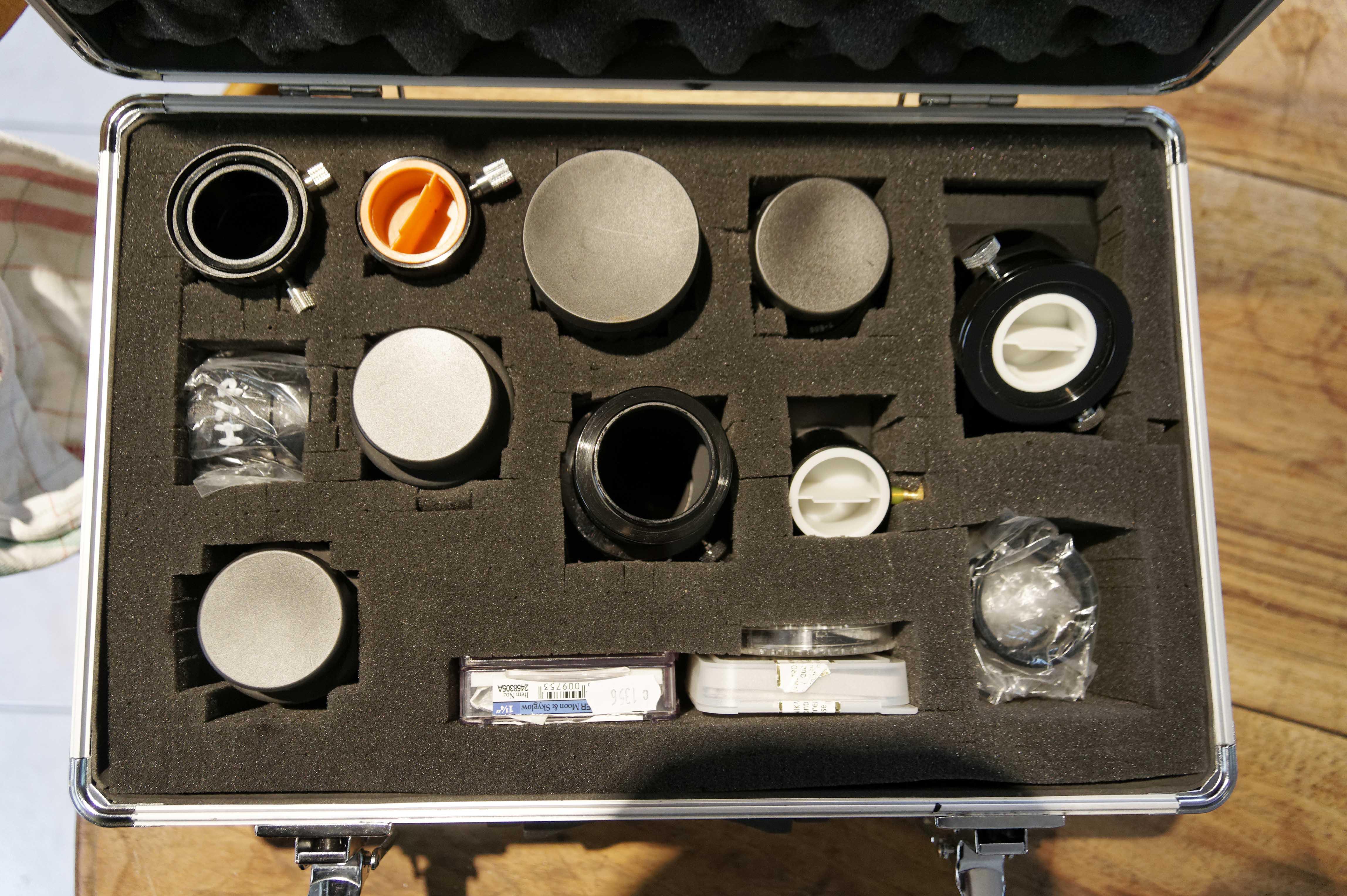 BarlowTV 2,5, le gros renvoi d'angle et le petit, le filtre UHC, un ND13 et un polarisant variable, ainsi que toute la plomberie de réduction de coulant, le réducteur correcteur de champ, les bagues T2 canon et sony, les bagues allonges des Hyp, le "couteau suisse" pour projection sur oculaire...