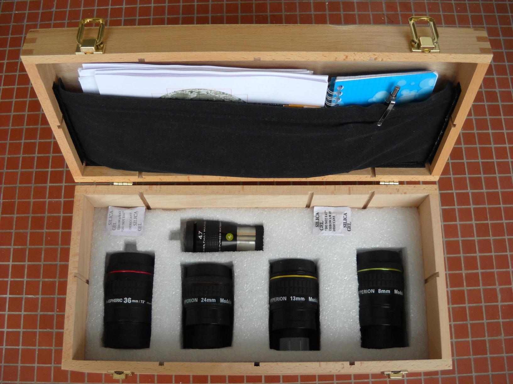 - de la mousse grise ondulée est collée sous le plateau pour éviter qu'il ne  soit posé directement sur les oculaires (même si ceux-ci ne dépassent pas  de la mousse blanche)