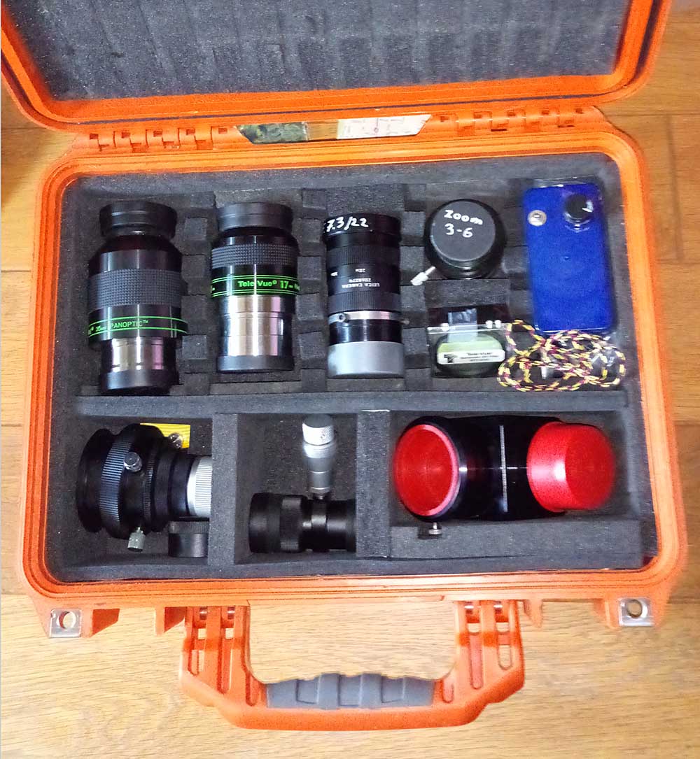 - deux couches de mousse blanche plus épaisse pour bloquer les oculaires latéralement,  une seule couche pour le plateau