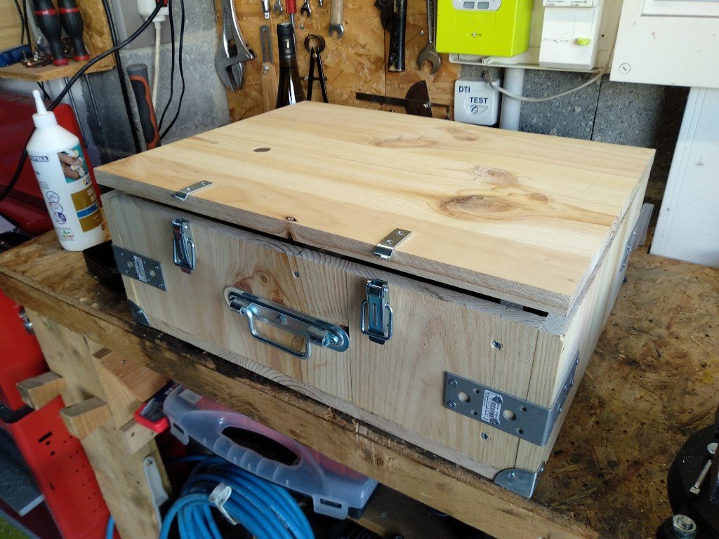 Très belle réalisation , pour fignoler, une petite lasure pour protéger ton bois et je rajouterai du tapis sur tes séparations verticale histoire de bien protéger la monture lorsque la valise est portée par la fameuse poignée