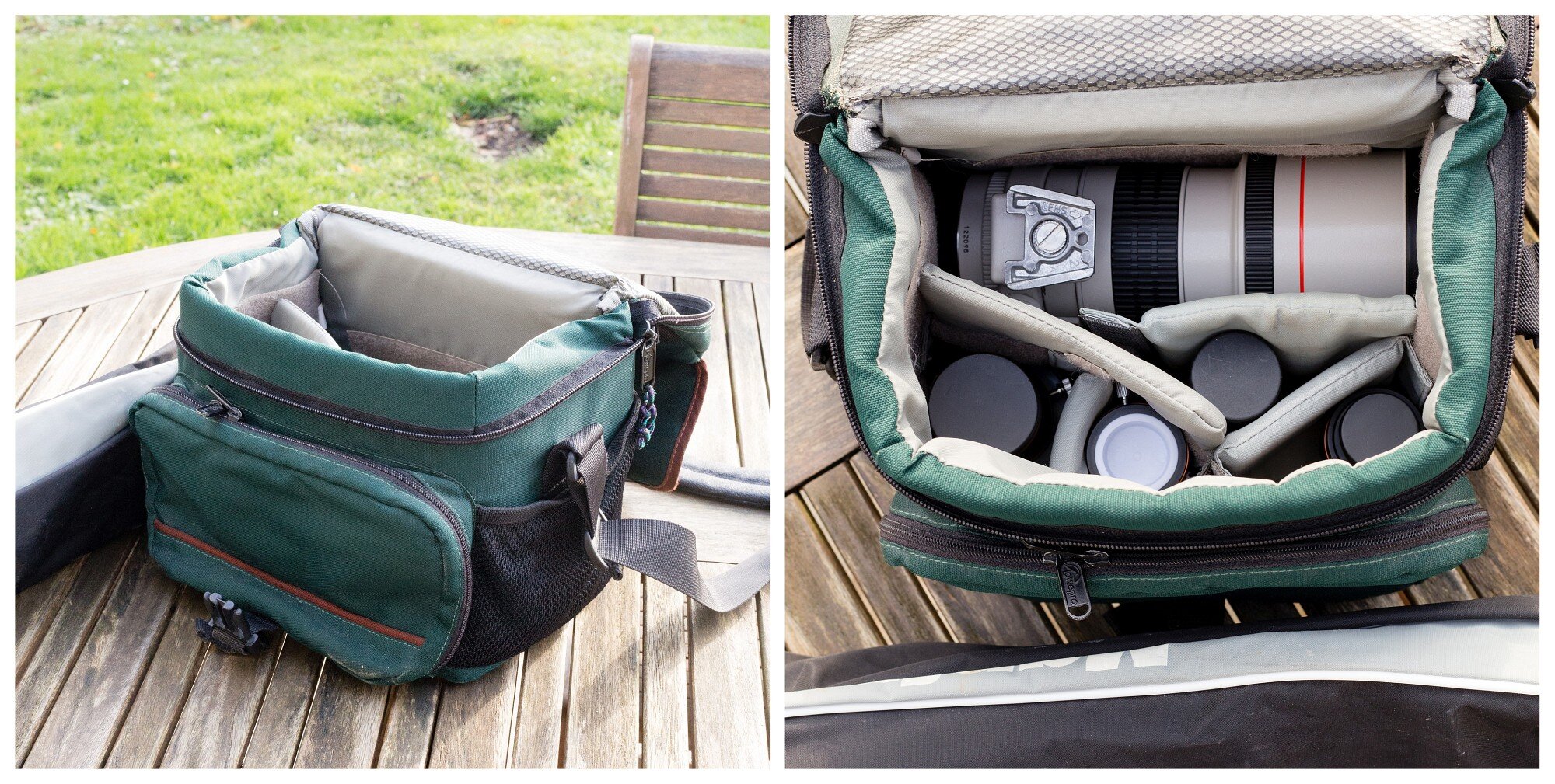 Bonjour à tous, après vous avoir présenté ma presque lunette dans la partie tests, je viens ici avec ma presque mallette 😁. Un simple sac photo dans lequel rentre la totalité de mon matériel : l'objectif 300/4 qui me sert de lunette et, dans l'ordre, l'adaptateur EF/1,25" avec un oculaire (X-Cel LX de 7 mm) monté dessus, une barlow 2x X-Cel LX, un Vixen LV de 2,5 mm et un X-Cel LX de 25 mm. Quand je pars en vadrouille, je place même ma paire de 7x35 (dans sa boîte) dessus parce qu'il reste vraiment beaucoup de place 😅.