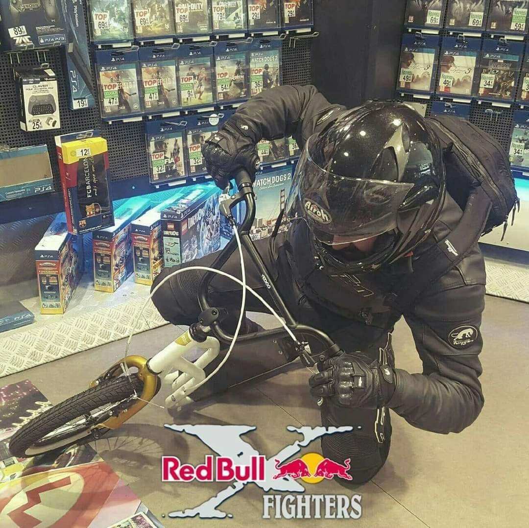 Pour la petite histoire c'était un inventaire dans un magasin, on était 6 inventoristes. Pas mal fut "choqué" que je me pointe à 6h du mat' sous la pluie en bécane. Bah moi la pluie ça m'empêche pas de rouler... Et y'en avait un qui était venu avec ce "vélo-trottinette". Puis voilà o' s'est bien marré quoi.