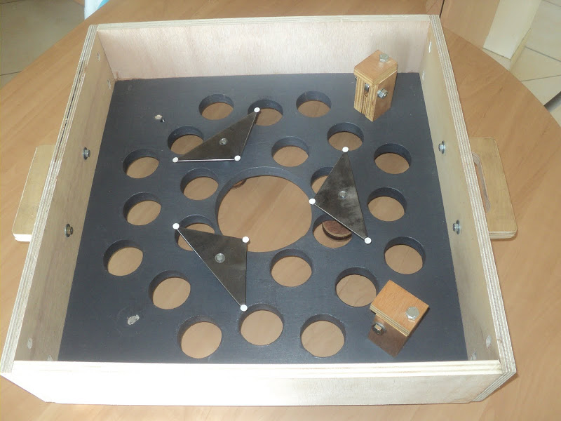 On ne voit pas très bien sur la photo,mais il y a encore 12 mm de matière de chaque cotés du trou et c'est du CTP ext. de 22mm quand même...de plus,le miroir pèse 12kgs;soit 1/3 du poids à peu près par triangle,donc 4kgs c'est pas la mer à boire...:)