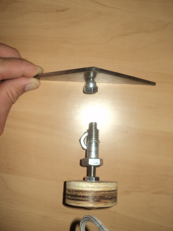 Ca n'a pas été du tout cuit...j'ai utilisé un feuillard de 2/10 de mm que j'ai brasé sur un carré de 12mm...ensuite j'ai brasé des écrous de 6mm sur une plaque de 4mm d'épaisseur...j'ai assemblé les deux pièces avec une tige filetée de 12mm que j'ai percé à 6mm pour pouvoir passer au centre de tout ça la tige (qui est fixée à la pièce en bois par une rotule)qui supportera le miroir.