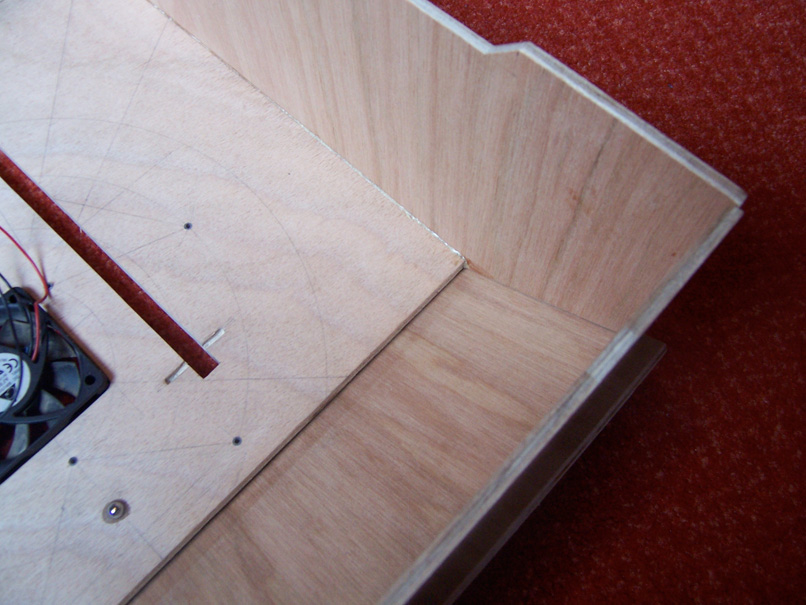 Bon je n'ai pas eu le temps de faire grand chose cette semaine, si ce n'est de fixer les haches dans le fond du couvercle de la valise, de percer les ouvertures pour le ventilo et pour son bouton marche/arrêt, de découper les cales du miroir, etc... et d'assembler la caisse du primaire (3 des 5 pans). A ce propos j'ai un petit soucis pour la collage du pan coupé. Je n'arrive pas à voir comment c'est fait. Et ce n'est pas faute d'avoir osculté toutes les photos de strock du net :be: Je ne comprends pas comment le pan de 5mm peut rattraper la hauteur de la planche du barillet. Voir ci-dessous :