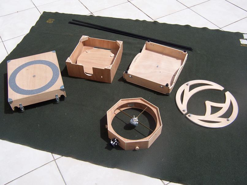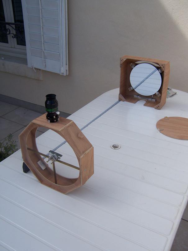 J'ai vu pas mal de solutions différentes sur vos instruments : ne pas mettre de taquets et brider le miroir contre le plateau pour les transports (Pierre), remplacer le plat à tarte par un plateau en bois (Hysot) mais quand même fixé sur le bas des cales, il y a aussi la solution de Gilles Bonnet (impossible à contacter via son site) qui me semble bien réussie mais les photos sur son site sont trop petites, je ne vois pas bien ce qu'il a fait.