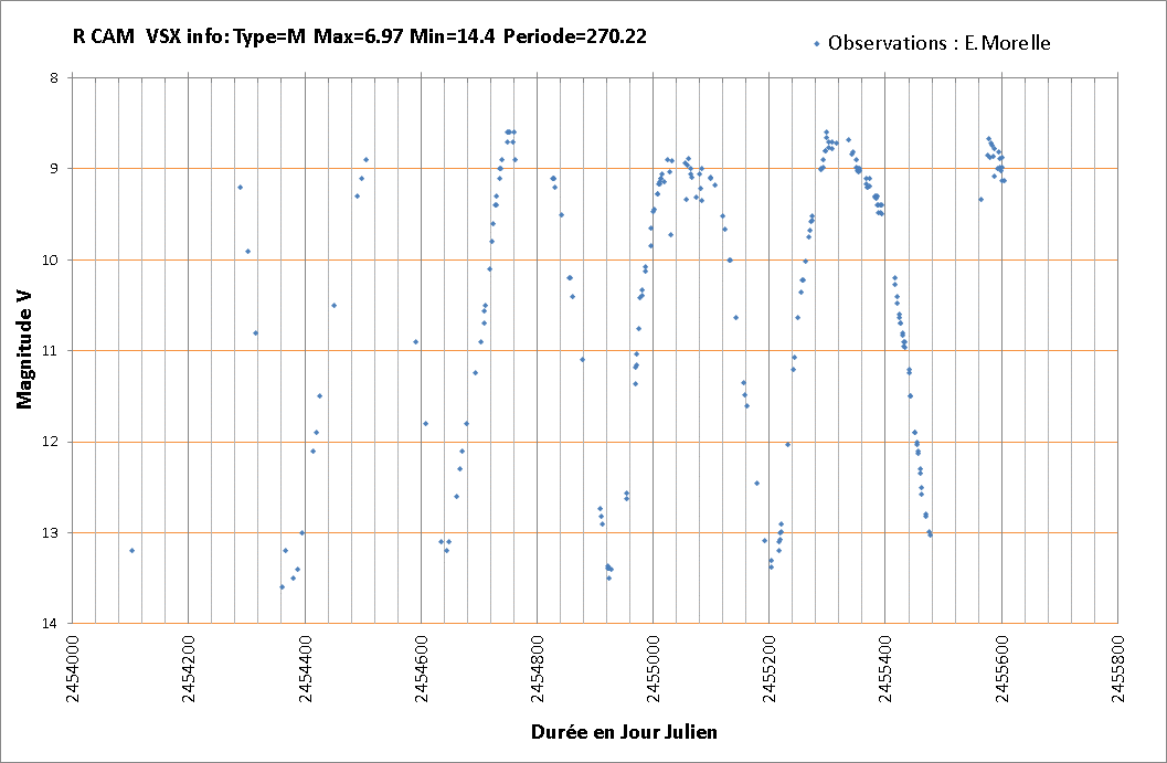 Il faudrait que tu nous préviennes lorsque l'une des étoiles que tu suis commence à dépasser mag 11 - si l'on a Ha en émission comme cela arrive au maxi de luminosité des Mira, on pourrait essayer d'intégrer les collègues qui font de la haute résolution. Peut-être est-il intéressant que surveiller l'IR proche, auquel cas le nouveau LISA (Shelyak Intruments) pourrait faire merveille.