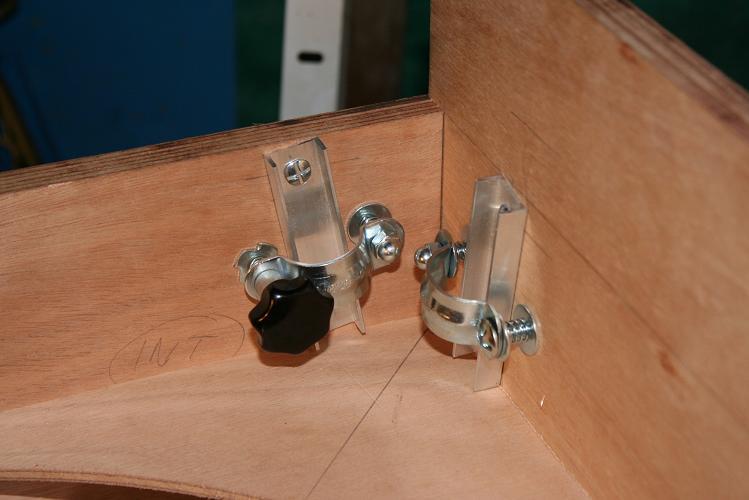 Pour la partie basse, je vais pour l’instant vers un blocage du tube avec tube en U, bouton moleté et collier de serrage electrique à la bonne dimension (même magasin pro electrique) mais ces cossses me donne envie d’un systeme ou les tubes seront également solidaire en bas. Tous le systeme « tubes » seraient ainsi à déplier comme j’ai pu le voir sur un skyvision. Plus compliqué a réalisé mais tentant…. Ou beaucoup plus simple, le trou des cosses, en bas, est tout simplement ouvert et je serre celles-ci avec un bouton moleté sur une vis….directement sur le bois de la caisse ou en ajoutant une plaque d’alu…. A voir